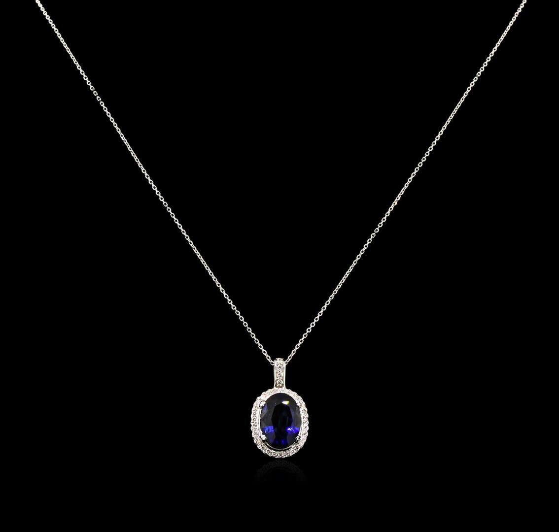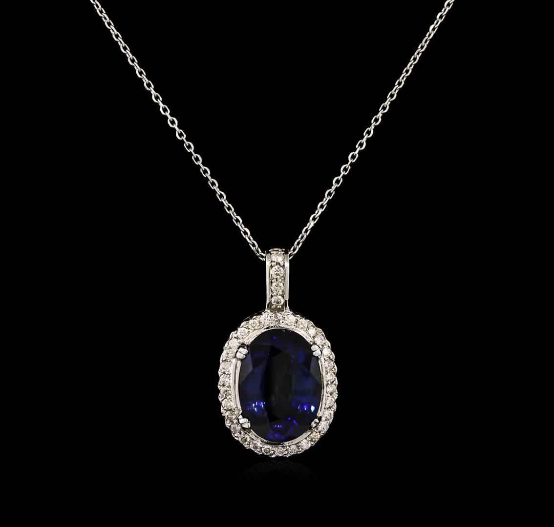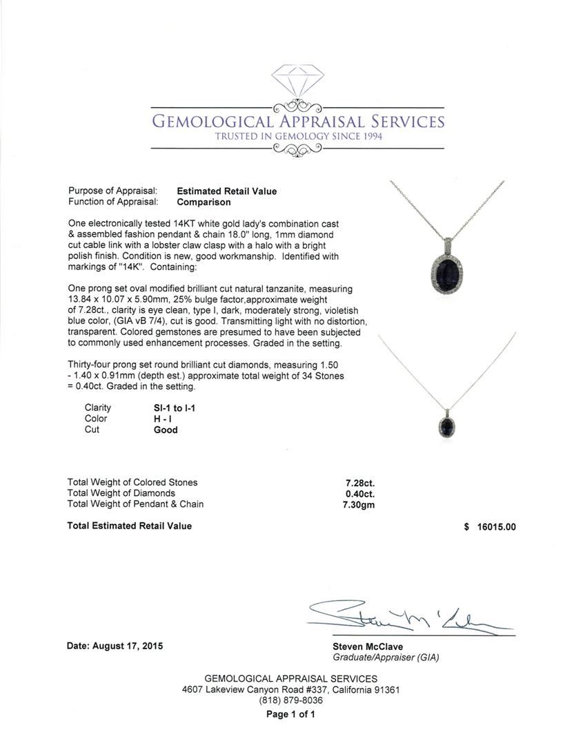 One electronically tested 14KT white gold lady's combination cast & assembled fashion pendant & chain 18.0" long, 1mm diamond cut cable link with a lobster claw clasp with a halo with a bright polish finish. Identified with markings of "14K". Condition is new, good workmanship. Containing: One prong set oval modified brilliant cut natural tanzanite, measuring 13.84 x 10.07 x 5.90mm, 25% bulge factor, approximate weight of 7.28ct., clarity is eye clean, type I, dark, moderately strong, violetish blue color, (GIA vB 7/4), cut is good. Transmitting light with no distortion, transparent. Colored gemstones are presumed to have been subjected to commonly used enhancement processes. Graded in the setting. Thirty-Four prong set round brilliant cut diamonds, measuring 1.50 - 1.40 x 0.91mm (depth est.) approximate total weight of 34 Stones = 0.40ct. Graded in the setting. Clarity: SI-1 to I-1. Color: H - I. Cut Good. Total Weight of Colored Stones 7.28ct. Total Weight of Diamonds 0.40ct. Total Weight of Pendant & Chain 7.30gm. GAS Appraised at $16,015.00.
