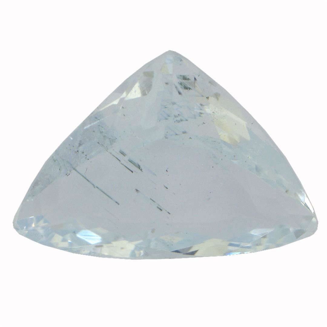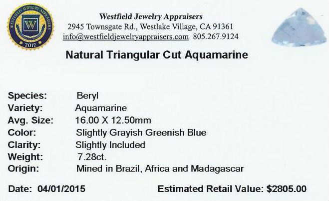 One triangle cut natural aquamarine exact weight 7.28ct., clarity is slightly included, type I, medium light, very slightly grayish, very slightly greenish blue color, (GIA vslgB 4/3), cut is good. Westfield Appraised at $2,805.00.
