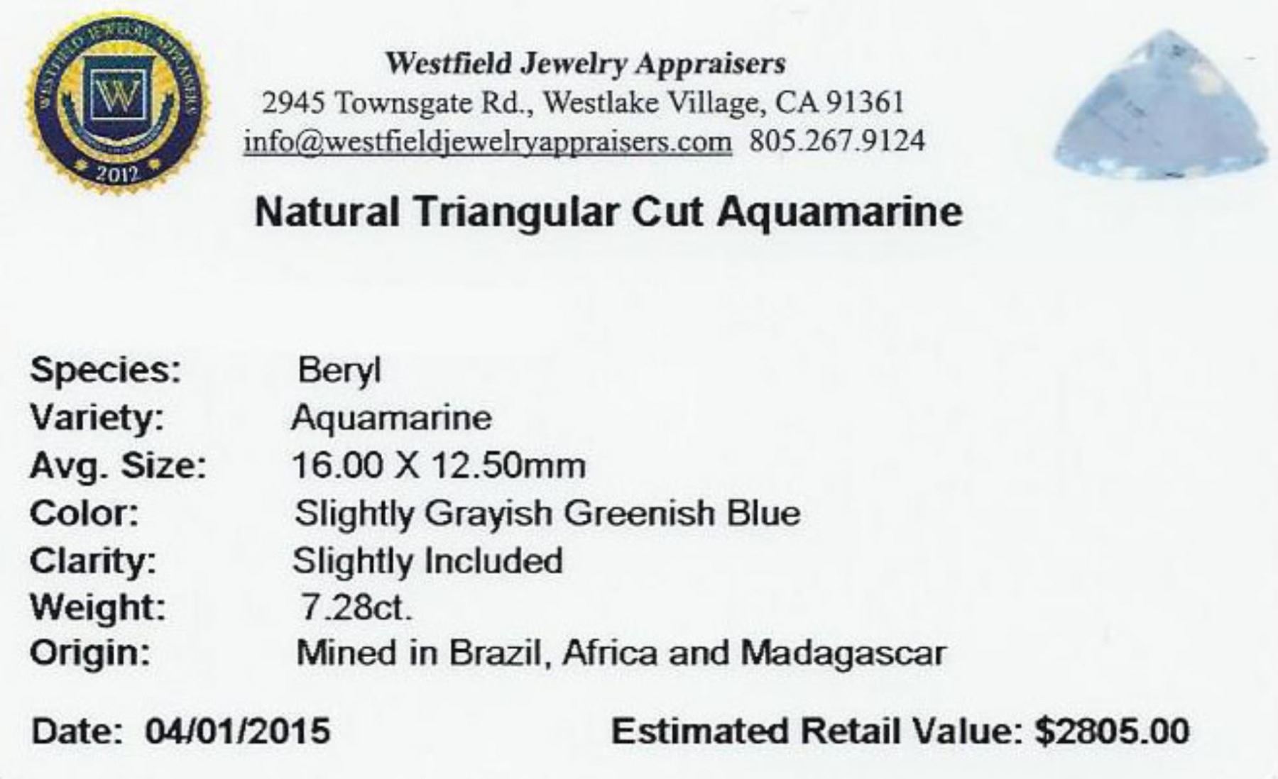One triangle cut natural aquamarine exact weight 7.28ct., clarity is slightly included, type I, medium light, very slightly grayish, very slightly greenish blue color, (GIA vslgB 4/3), cut is good. Westfield Appraised.