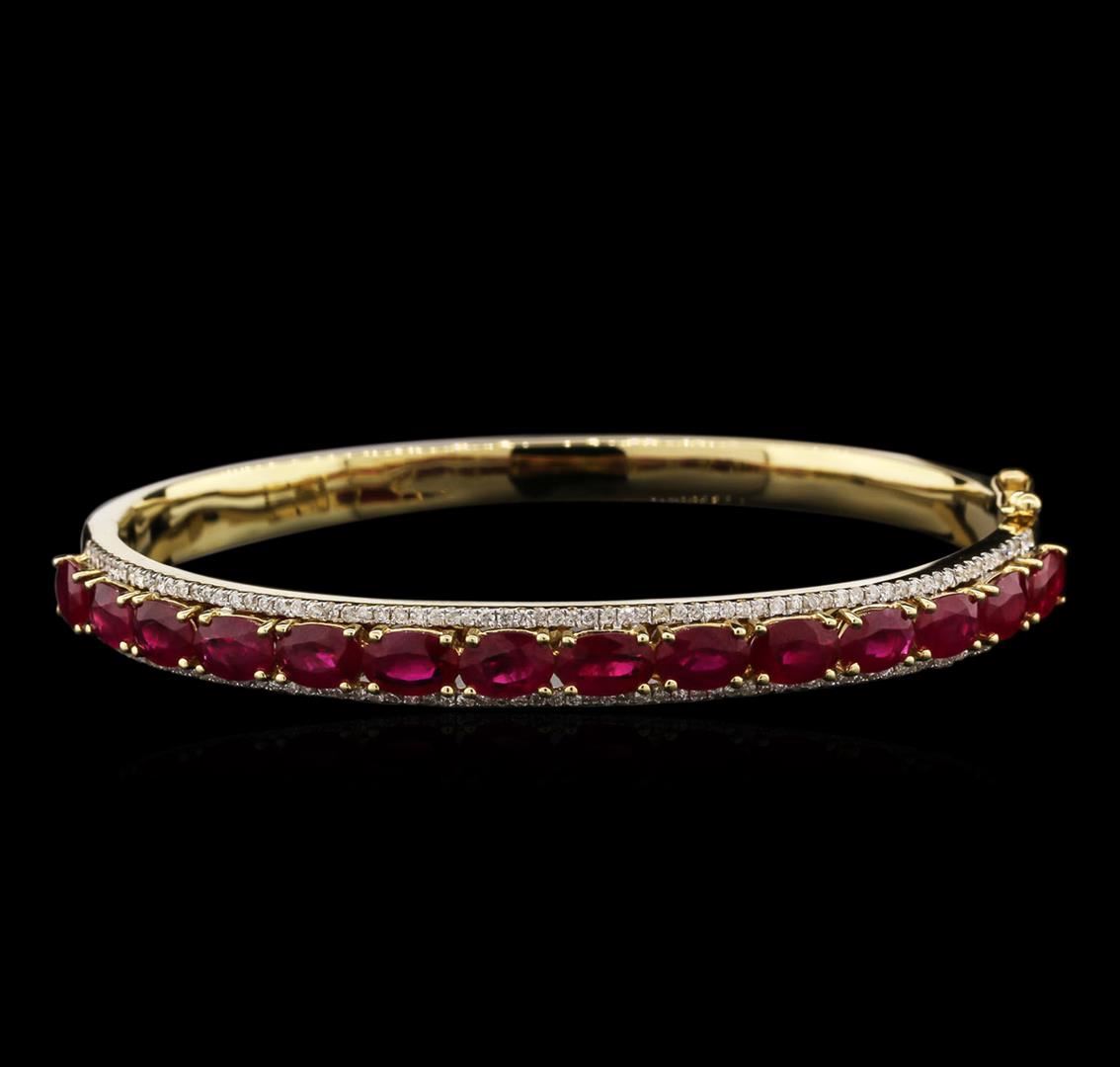 One electronically tested 14KT yellow gold ladies cast ruby and diamond bangle bracelet with a hidden box clasp with safety closer with a bright polish finish. Identified with markings of "14K". Condition is new. Containing: Fourteen prong set oval modified brilliant cut natural rubies, measuring 6.00 x 4.00 x 2.60mm, approximate total weight of 7.28ct., clarity is heavily included, type II, medium dark, very slightly brownish, strongly purplish red color, (GIA stpR 6/3), cut is good. One Hundred Forty-Two prong set round brilliant cut diamonds, measuring 1.20 - 1.20 x 0.72mm (depth est.) approximate total weight of 142 Stones = 0.90ct. Clarity: I-1 to I-2. Color: I - J, Cut is Good. Colored gemstones are presumed to have been subjected to commonly used enhancement processes. All diamonds and colored gemstones are graded in the mounting, unless otherwise stated. Total Weight of Colored Stones 7.28ct. Total Weight of Diamonds 0.90ct. Total Weight of Bangle Bracelet 19.60 grams. GGL Appraised at $4,770.00.