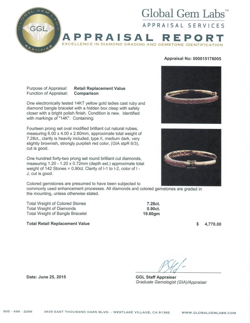 One electronically tested 14KT yellow gold ladies cast ruby and diamond bangle bracelet with a hidden box clasp with safety closer with a bright polish finish. Identified with markings of "14K". Condition is new. Containing: Fourteen prong set oval modified brilliant cut natural rubies, measuring 6.00 x 4.00 x 2.60mm, approximate total weight of 7.28ct., clarity is heavily included, type II, medium dark, very slightly brownish, strongly purplish red color, (GIA stpR 6/3), cut is good. One Hundred Forty-Two prong set round brilliant cut diamonds, measuring 1.20 - 1.20 x 0.72mm (depth est.) approximate total weight of 142 Stones = 0.90ct. Clarity: I-1 to I-2. Color: I - J, Cut is Good. Colored gemstones are presumed to have been subjected to commonly used enhancement processes. All diamonds and colored gemstones are graded in the mounting, unless otherwise stated. Total Weight of Colored Stones 7.28ct. Total Weight of Diamonds 0.90ct. Total Weight of Bangle Bracelet 19.60 grams. GGL Appraised at $4,770.00.