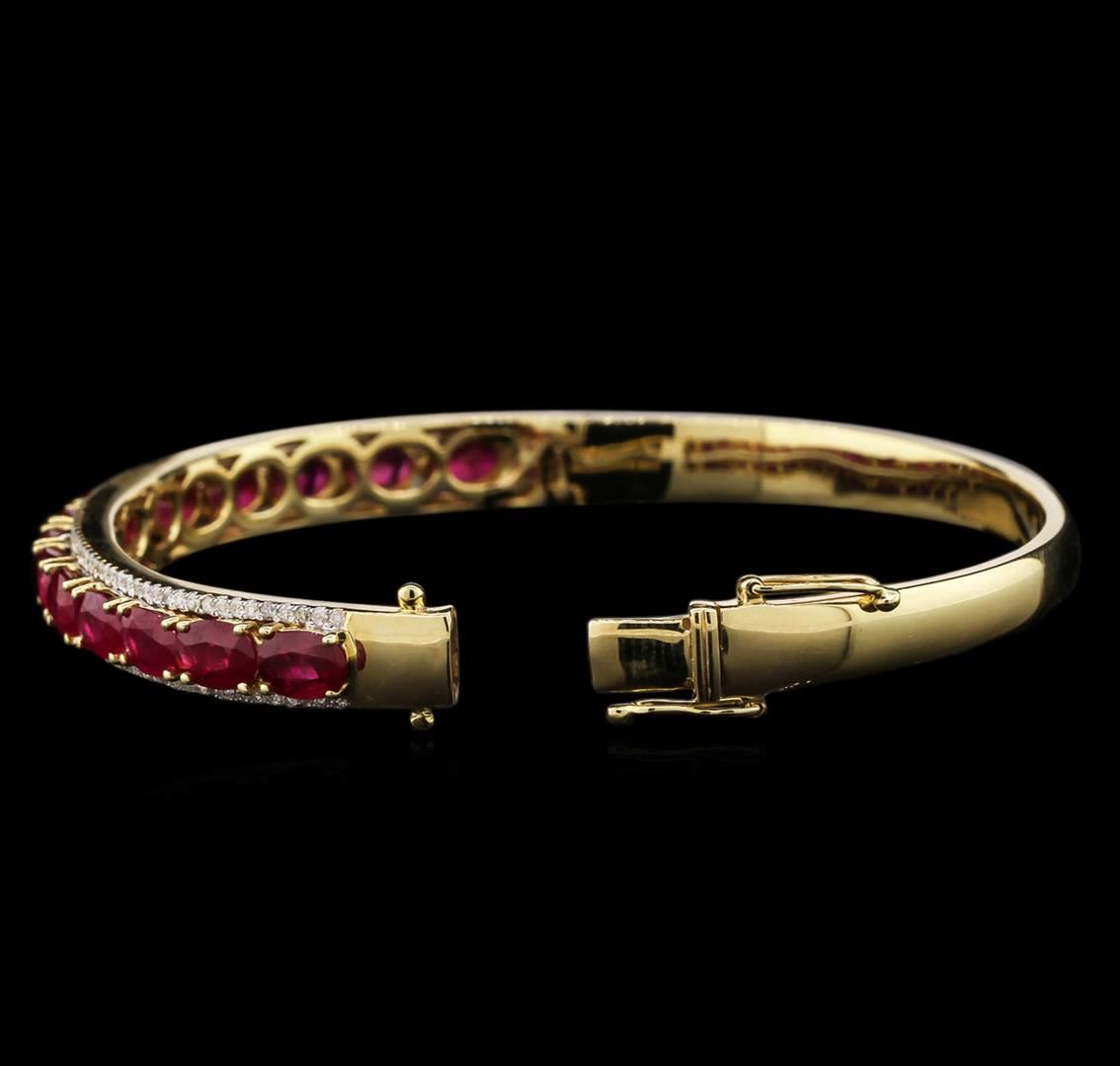One electronically tested 14KT yellow gold ladies cast ruby and diamond bangle bracelet with a hidden box clasp with safety closer with a bright polish finish. Identified with markings of "14K". Condition is new. Containing: Fourteen prong set oval modified brilliant cut natural rubies, measuring 6.00 x 4.00 x 2.60mm, approximate total weight of 7.28ct., clarity is heavily included, type II, medium dark, very slightly brownish, strongly purplish red color, (GIA stpR 6/3), cut is good. One Hundred Forty-Two prong set round brilliant cut diamonds, measuring 1.20 - 1.20 x 0.72mm (depth est.) approximate total weight of 142 Stones = 0.90ct. Clarity: I-1 to I-2. Color: I - J, Cut is Good. Colored gemstones are presumed to have been subjected to commonly used enhancement processes. All diamonds and colored gemstones are graded in the mounting, unless otherwise stated. Total Weight of Colored Stones 7.28ct. Total Weight of Diamonds 0.90ct. Total Weight of Bangle Bracelet 19.60 grams. GGL Appraised at $4,770.00.