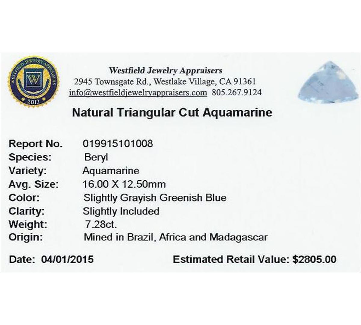 One triangle cut natural aquamarine exact weight 7.28ct., clarity is slightly included, type I, medium light, very slightly grayish, very slightly greenish blue color, (GIA vslgB 4/3), cut is good. Westfield Appraised at $2,805.00.
