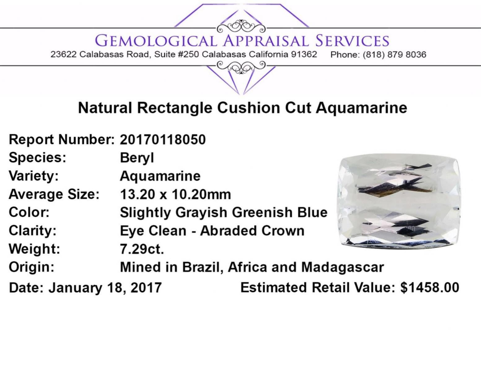 One natural rectangle cushion cut aquamarine with an exact weight of 7.29ct., clarity is eye clean - abraded crown, slightly grayish greenish blue. Gemological Appraisals Services estimates the retail value at $1458 GAS Appraised.