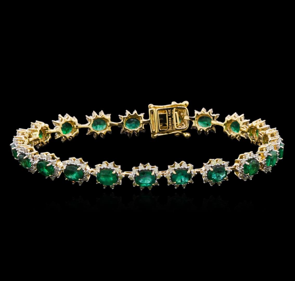 One electronically tested 14KT yellow gold ladies cast & assembled emerald and diamond bracelet. Seven and one-half inch length bracelet features a flexible emerald and diamond floret ribbon, terminating in a concealed clasp with twin safeties. Bright polish finish with rhodium accents. Trademark is Orianne. Identified with markings of "14K". Condition is new, good workmanship. Containing: Twenty-one prong set oval mixed cut natural emeralds approximate total weight of 7.29ct., clarity is heavily included, type III, medium dark, moderately strong, very slightly bluish green color, (GIA vslbG 6/4), cut is good. Transmitting light somewhat diffusely, transparent to translucent. Naturally occurring internal & external characteristics are present. Color grade is an average for the group. Indications of oil residue. Graded in the setting. Two Hundred Ten prong set round brilliant cut diamonds approximate total weight of 210 Stones = 1.86ct. Graded in the setting. Clarity: I-2 to I-3. Color: I - K. Total Weight of Colored Stones 7.29ct. Total Weight of Diamonds 1.86ct. Total Weight of Bracelet 13.20gm. AIG Appraised at $10,315.00.