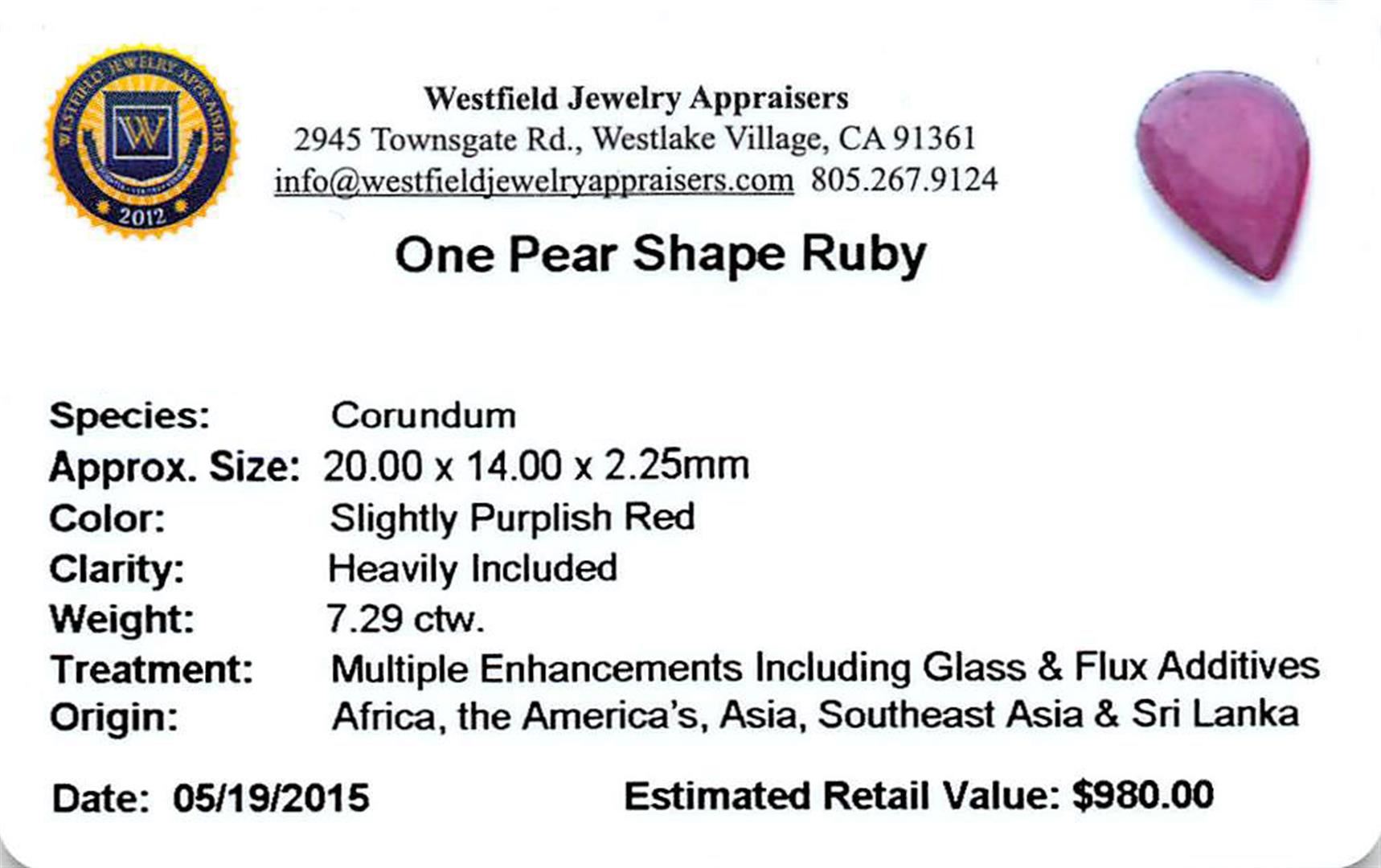 One pear mixed cut natural ruby, measuring 20.00 x 14.00 x 2.25mm, exact weight 7.29ct., clarity is heavily included, type II, medium dark, very slightly brownish, slightly purplish red color, (GIA slpR 6/3), cut is good. Westfield Appraised at $980.00.