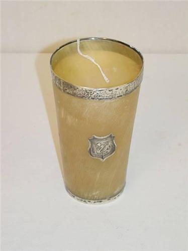 7 3/4" 19TH CENT. HORN TUMBLER W/ ENGLISH SILVER TRIM & SAILORS CREST LONDON W/ MAKERS MARK T.B. - SPLIT IN HORN NEAR BASE & DENT IN SILVER ON BASE;