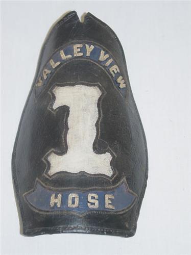 7 3/4" BLACK LEATHER HIGH EAGLE FIRE HELMET FRONT W/ WHITE CUT-OUT LETTERS "VALLEY VIEW HOSE #1";