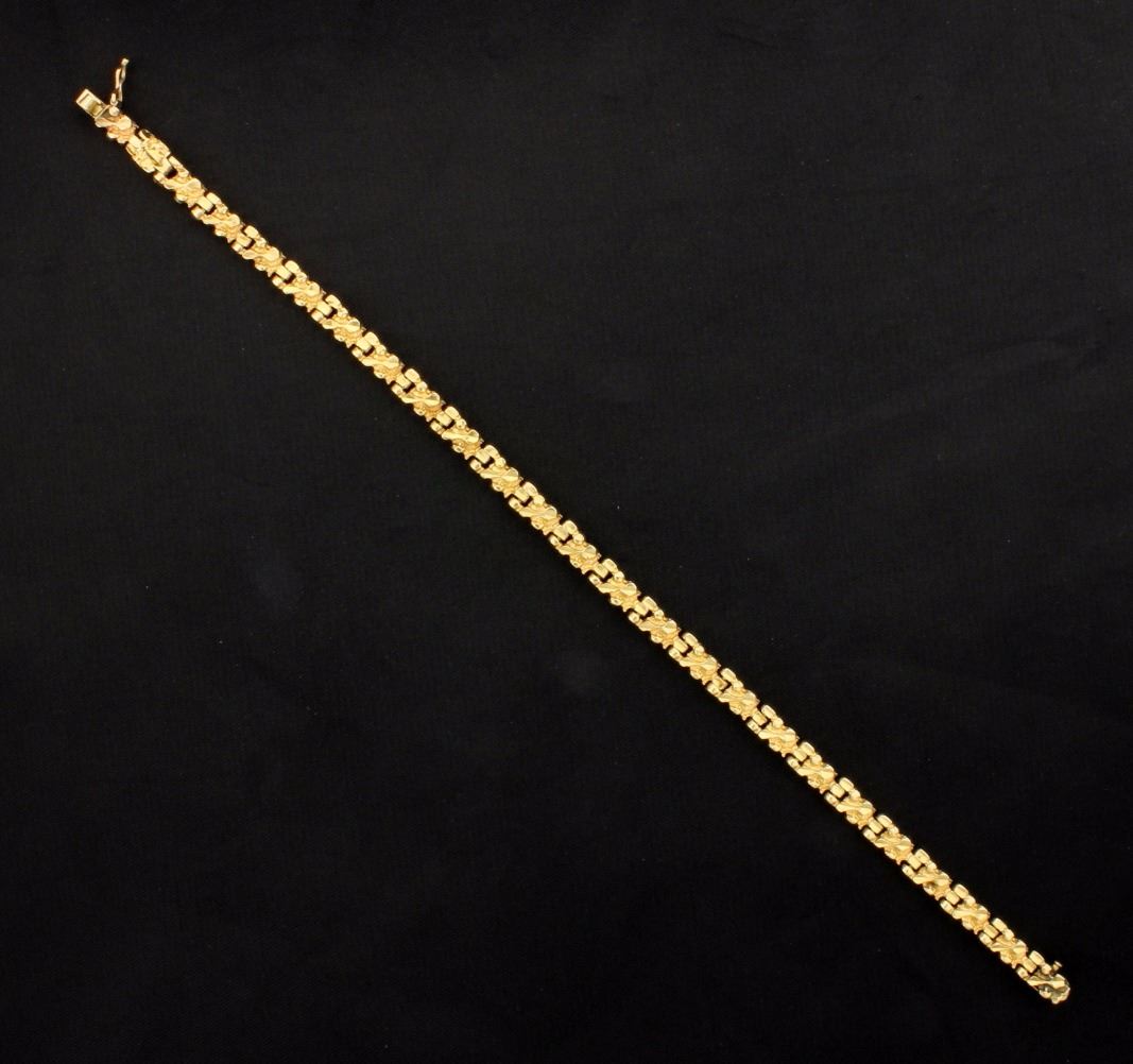 14K yellow gold, it is 4.5mm wide and has a safety clasp. 11.9g