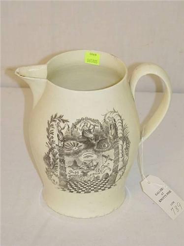7 3/4" LIVERPOOL JUG W/ MASONIC TRANSFER - PITTING TO BODY & REPAIR TO SPOUT;