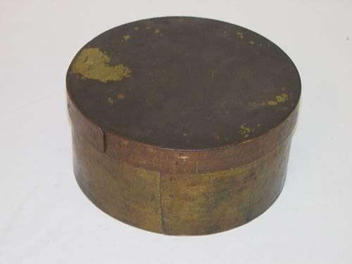 7 3/4" ROUND PANTRY BOX W/ COPPER NAILS & TRACES OF GREEN PAINT - WEAR & IMPERFECTIONS;