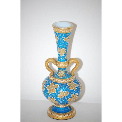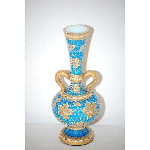 7 3/4" VICTORIAN CASED ART GLASS VASE W/ HEAVY COROLENE TYPE GOLD FLORAL DECORATION-JEWELED & HIGHLIGHTED W/ WHITE ENAMEL PAINT, UNMARKED - MINOR WEAR & LOSSES TO DECORATION
