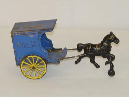 7 3/4" WILKINS HORSE DRAWN MILK WAGON-BLACK HORSE W/ BLUE MILK CART - PAINT LOSSES & WEAR