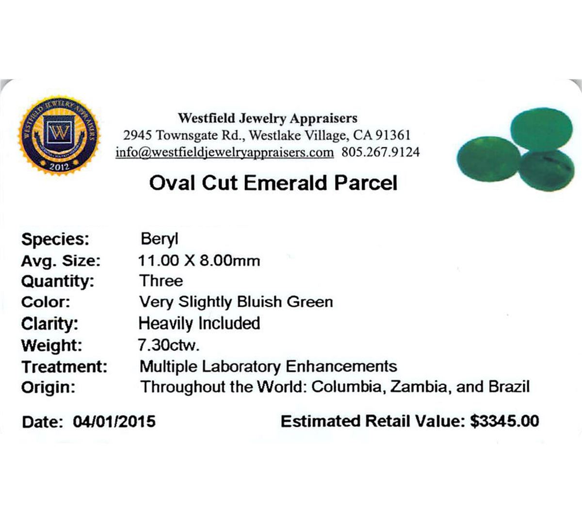 Three oval mixed cut natural emeralds exact total weight 7.30ct., clarity is heavily included, type III, medium dark, very slightly grayish, very slightly bluish green color, (GIA vslbG 6/3), cut is good. Westfield Appraised at $3,345.00.