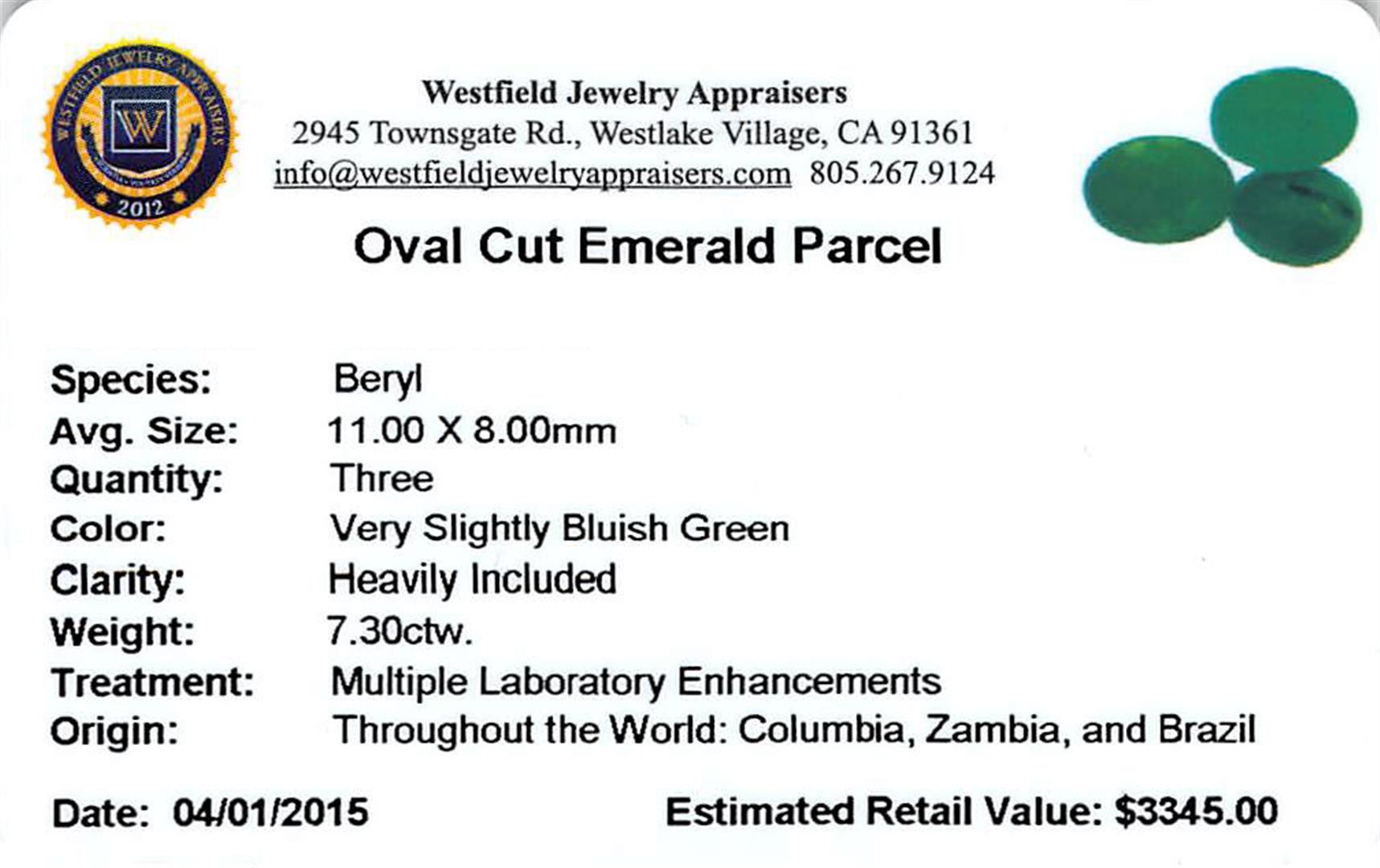 Three oval mixed cut natural emeralds exact total weight 7.30ct., clarity is heavily included, type III, medium dark, very slightly grayish, very slightly bluish green color, (GIA vslbG 6/3), cut is good. Westfield Appraised at $3,345.00.