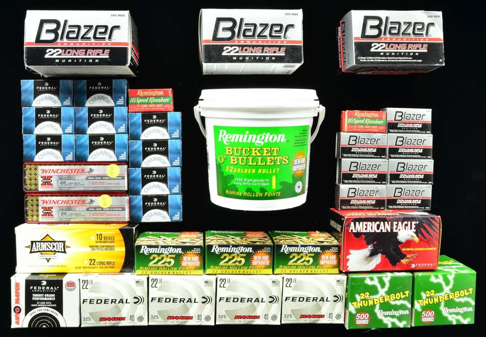 REMINGTON: 1) Bucket 'O Bullets 1,400 rds. 36 gr. HP 2) 3 boxes 225 rds. each 36 gr. HP. 3) 1 1/2 boxes 500 rds. each 45 gr. solid. 4) 1 1/2 red / green vintage boxes 50 rds. Shot. FEDERAL: 1) 5 boxes 325 rds. each 40 gr. solid Auto Match. 2) 1 brick 500 rds. American Eagle 40 gr. solid. 3) 10 boxes 50 rds. Champion 40 gr. solid. CCI: 3.7 bricks 500 rds. Blazer. ARMSCOR: 1 brick 500 rds. 36 gr. HP. WINCHESTER: 2 boxes 100 rds. 40 gr. solid. (02-16815-3/NW). $350-500.