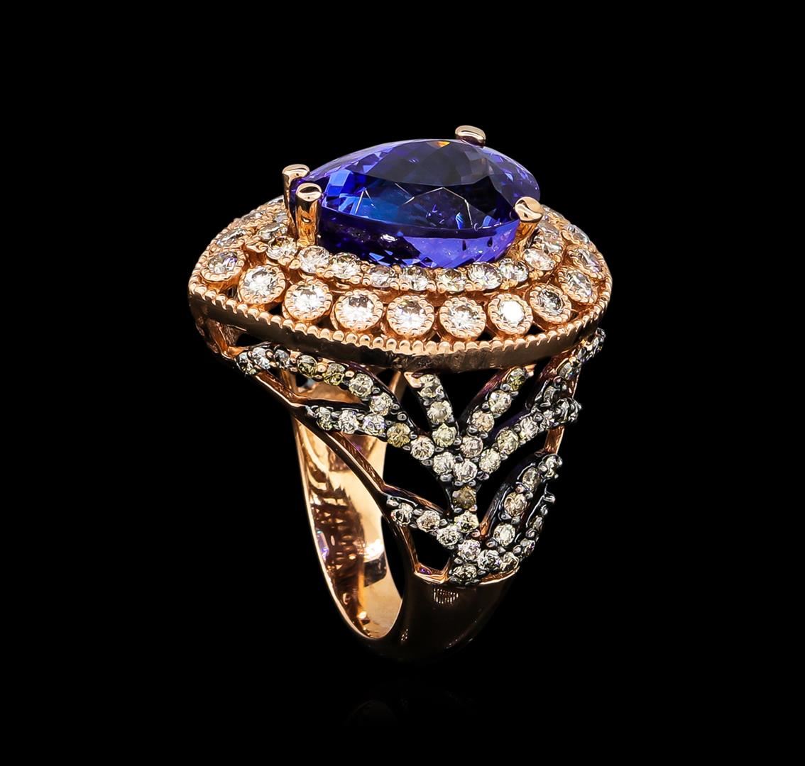 One electronically tested 14KT rose gold ladies cast tanzanite and diamond ring. The featured tanzanite is set within tiered diamond bezels supported by diamond set floral motif shoulders, completed by a four millimeter wide band. Bright polish finish with milgrain detailing and black rhodium accents. Identified with markings of "14K". Condition is new, good workmanship. Containing: One prong set pear mixed cut natural tanzanite, measuring 13.70 x 10.50 x 7.57mm, approximate weight of 7.31ct., clarity is eye clean, type I, medium, moderately strong, bluish violet color, (GIA bV 5/4) to medium light, moderately strong, purple, (GIA P 4/4), cut is good. Transmitting light with no distortion, transparent. Colored Stone Grading Report attached. Graded in the setting. Tanzanite is found in Tanzania. Originally discovered in 1967. Tiffany & Company, named the stone Tanzanite. It is found in the Usumburu Mountains of northern Tanzania. Tanzanite occurs in gray, brown, violet, blue, reddish-purple, & green. It is interesting because of the exceptional pleochroism. Rotated, a tanzanite will exhibit multiple changes of color. Tanzanite has a low tolerance to ultrasonic cleaning, do not use this cleaning method. Forty-Two prong and bezel set round brilliant cut diamonds, measuring 1.90 - 1.80 x 1.11mm (depth est.) approximate total weight of 42 Stones = 0.97ct. Graded in the setting. Clarity: SI-1 to I-1. Color: I - K Ninety-Eight prong set round brilliant cut diamonds, measuring 1.50 - 1.35 x 0.86mm (depth est.) approximate total weight of 98 Stones = 1.05ct. Graded in the setting. Clarity: SI-1 to I-1. Total Weight of Colored Stones 7.31ct. Total Weight of Diamonds 2.02ct. AIG Appraised at $24,000.00.
