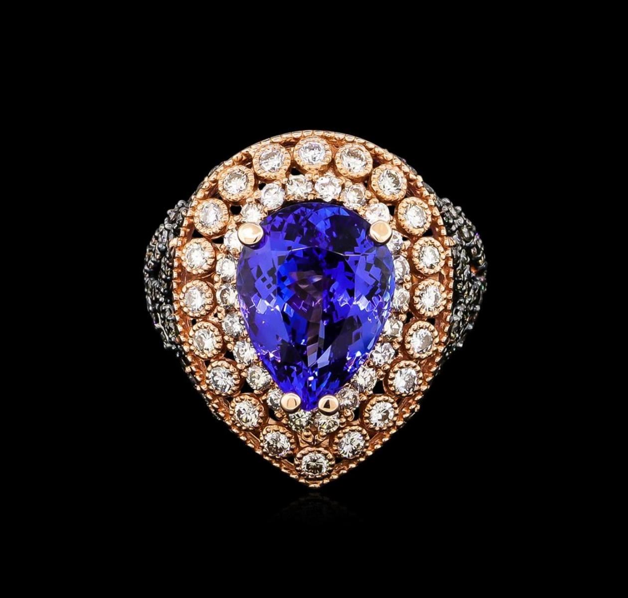 One electronically tested 14KT rose gold ladies cast tanzanite and diamond ring. The featured tanzanite is set within tiered diamond bezels supported by diamond set floral motif shoulders, completed by a four millimeter wide band. Bright polish finish with milgrain detailing and black rhodium accents. Identified with markings of "14K". Condition is new, good workmanship. Containing: One prong set pear mixed cut natural tanzanite, measuring 13.70 x 10.50 x 7.57mm, approximate weight of 7.31ct., clarity is eye clean, type I, medium, moderately strong, bluish violet color, (GIA bV 5/4) to medium light, moderately strong, purple, (GIA P 4/4), cut is good. Transmitting light with no distortion, transparent. Colored Stone Grading Report attached. Graded in the setting. Tanzanite is found in Tanzania. Originally discovered in 1967. Tiffany & Company, named the stone Tanzanite. It is found in the Usumburu Mountains of northern Tanzania. Tanzanite occurs in gray, brown, violet, blue, reddish-purple, & green. It is interesting because of the exceptional pleochroism. Rotated, a tanzanite will exhibit multiple changes of color. Tanzanite has a low tolerance to ultrasonic cleaning, do not use this cleaning method. Forty-Two prong and bezel set round brilliant cut diamonds, measuring 1.90 - 1.80 x 1.11mm (depth est.) approximate total weight of 42 Stones = 0.97ct. Graded in the setting. Clarity: SI-1 to I-1. Color: I - K Ninety-Eight prong set round brilliant cut diamonds, measuring 1.50 - 1.35 x 0.86mm (depth est.) approximate total weight of 98 Stones = 1.05ct. Graded in the setting. Clarity: SI-1 to I-1. Total Weight of Colored Stones 7.31ct. Total Weight of Diamonds 2.02ct. AIG Appraised.