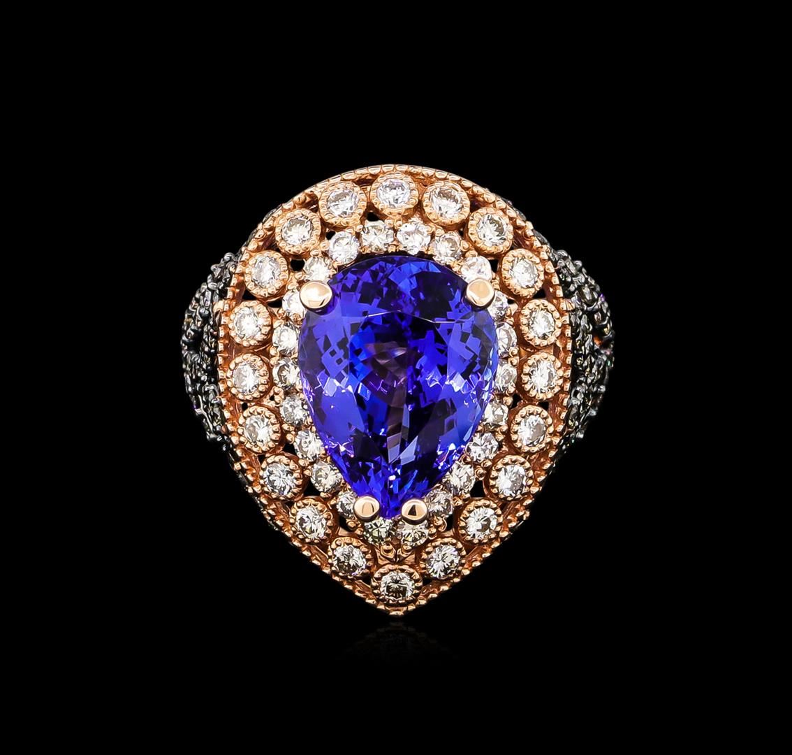 One electronically tested 14KT rose gold ladies cast tanzanite and diamond ring. The featured tanzanite is set within tiered diamond bezels supported by diamond set floral motif shoulders, completed by a four millimeter wide band. Bright polish finish with milgrain detailing and black rhodium accents. Identified with markings of "14K". Condition is new, good workmanship. Containing: One prong set pear mixed cut natural tanzanite, measuring 13.70 x 10.50 x 7.57mm, approximate weight of 7.31ct., clarity is eye clean, type I, medium, moderately strong, bluish violet color, (GIA bV 5/4) to medium light, moderately strong, purple, (GIA P 4/4), cut is good. Transmitting light with no distortion, transparent. Colored Stone Grading Report attached. Graded in the setting. Tanzanite is found in Tanzania. Originally discovered in 1967. Tiffany & Company, named the stone Tanzanite. It is found in the Usumburu Mountains of northern Tanzania. Tanzanite occurs in gray, brown, violet, blue, reddish-purple, & green. It is interesting because of the exceptional pleochroism. Rotated, a tanzanite will exhibit multiple changes of color. Tanzanite has a low tolerance to ultrasonic cleaning, do not use this cleaning method. Forty-Two prong and bezel set round brilliant cut diamonds, measuring 1.90 - 1.80 x 1.11mm (depth est.) approximate total weight of 42 Stones = 0.97ct. Graded in the setting. Clarity: SI-1 to I-1. Color: I - K Ninety-Eight prong set round brilliant cut diamonds, measuring 1.50 - 1.35 x 0.86mm (depth est.) approximate total weight of 98 Stones = 1.05ct. Graded in the setting. Clarity: SI-1 to I-1. Total Weight of Colored Stones 7.31ct. Total Weight of Diamonds 2.02ct. AIG Appraised.
