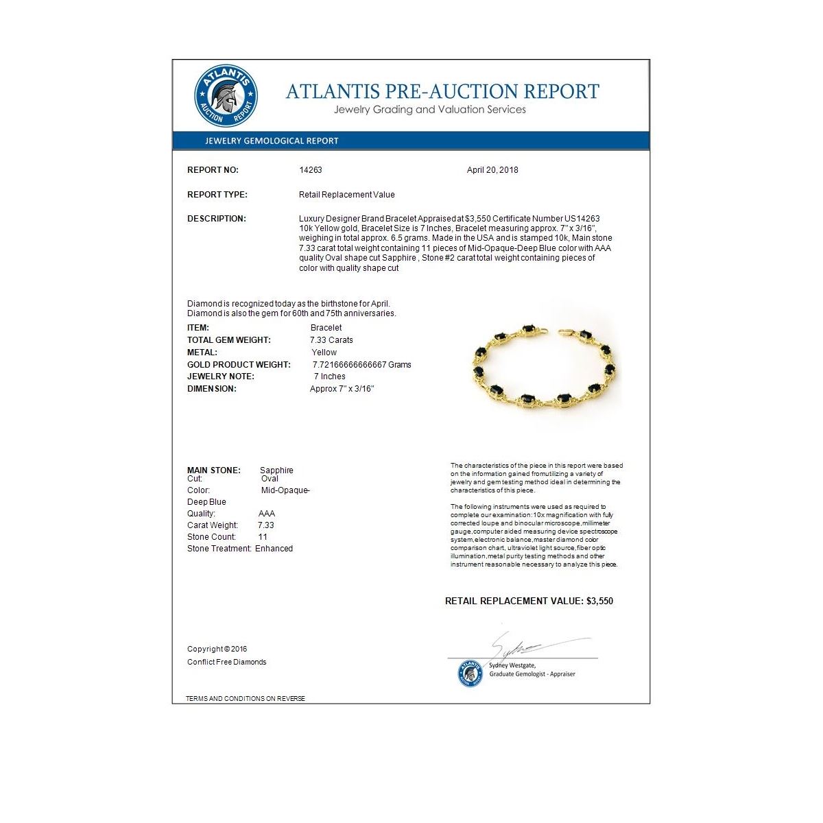 REF-53Y6K -14263 ---- 7.33 CTW Blue Sapphire Bracelet 10K Yellow Gold ---- Luxury Designer Brand Bracelet Appraised at $3,550 Certificate Number US14263 10k Yellow gold, Bracelet Size is 7 Inches, Bracelet measuring approx. 7" x 3/16", weighing in total approx. 6.5 grams. Made in the USA and is stamped 10k, Main stone 7.33 carat total weight containing 11 pieces of Mid-Opaque-Deep Blue color with AAA quality Oval shape cut Sapphire , Stone #2 carat total weight containing pieces of color with quality shape cut