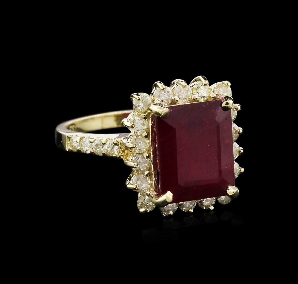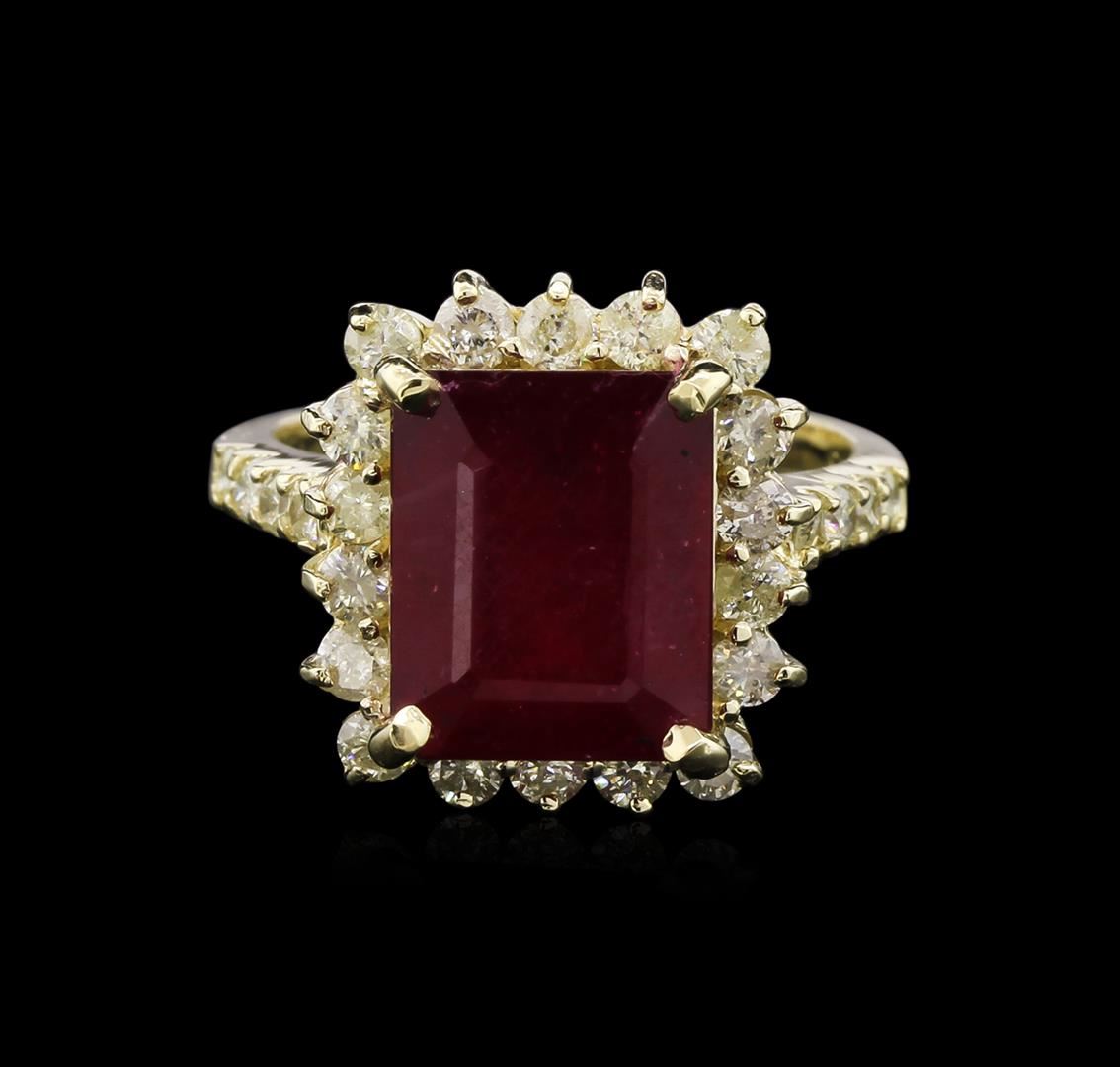 Fourteen karat (14K) yellow gold ruby and diamond ring. An emerald cut ruby corundum gemstone is prong mounted in the center of the ring. Round brilliant cut diamonds accent the ring around the center gemstone and on both sides. The ring is cast stamped "14K" and has a gross weight of 6.5 Grams. Diamond(s): Shape: Round Brilliant Cut. Weight: 1.09 carat (26pcs). Average Clarity: I1-I2. Average Color: H-J. Symmetry: Very Good. Polish: Very Good. GemStone(s): Ruby Corundum. Nature: Natural. Shape: Emerald, Faceted. Quantity: 1, Mounted. Weight: 7.33 carat. Dimensions: Length- 11.15 mm. ; Width 9.14 mm. Bulge: Visible. Clarity: I1, Type 3. Color: Red (5/5). Symmetry: Very Good. Color Intensity: Medium. Transparency: Transparent. Tone: Dark. Enhancements: Indications of high temperature heat treatment, with glass and flux additives. Metal(s): Metal: Gold, Stamped. Purity: 14K. Color: Yellow. Condition: Excellent. Finish: High polish. GGA Appraised at $5,440.00.