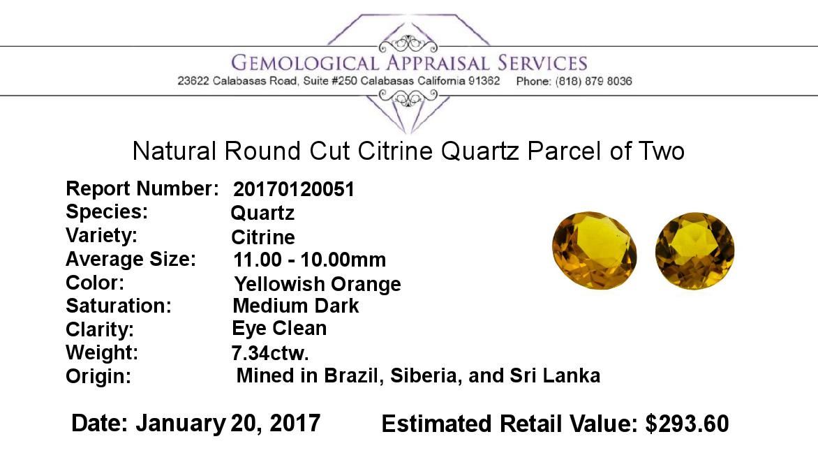 One natural round cut citrine quartz parcel of two with an exact weight of 7.34ctw., clarity is eye clean, yellowish orange, medium dark. Gemological Appraisals Services estimates the retail value at $293.6 GAS Appraised.