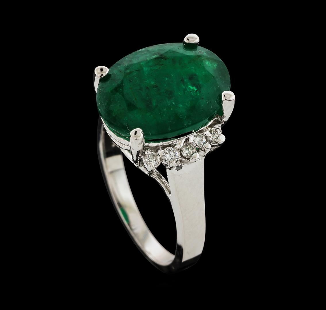 One electronically tested 14KT white gold lady's cast fashion ring with a cathedral shank with a bright polish finish. The featured lady's ring has diamond set shoulders and a shank measuring 2.08 millimeters wide. Identified with markings of '14K'. Condition is new, good workmanship. Containing: One prong set oval modified mixed cut natural emerald, measuring 15.16 x 11.30 x 6.01mm, (depth est.) 20%. bulge factor, approximate weight of 7.35ct., clarity is heavily included, medium dark, moderately strong, green color, (GIA G 6/4), cut is good. Transmitting light somewhat diffusely, semi-transparent to translucent. Naturally occurring internal & external characteristics are present. Indications of oil residue. Colored gemstones are presumed to have been subjected to commonly used enhancement processes. Graded in the setting. Ten prong set round brilliant cut diamonds, measuring 1.90 - 1.80 x 1.11mm (depth est.) approximate total weight of 10 Stones = 0.23ct. Graded in the setting. Clarity SI-1 to SI-2. Color: G - H Cut Good. Total Weight of Colored Stones 7.35ct.. Total Weight of Diamonds 0.23ct.. Total Weight of Ring 7.00gm GAS Appraised at $7,960.00.