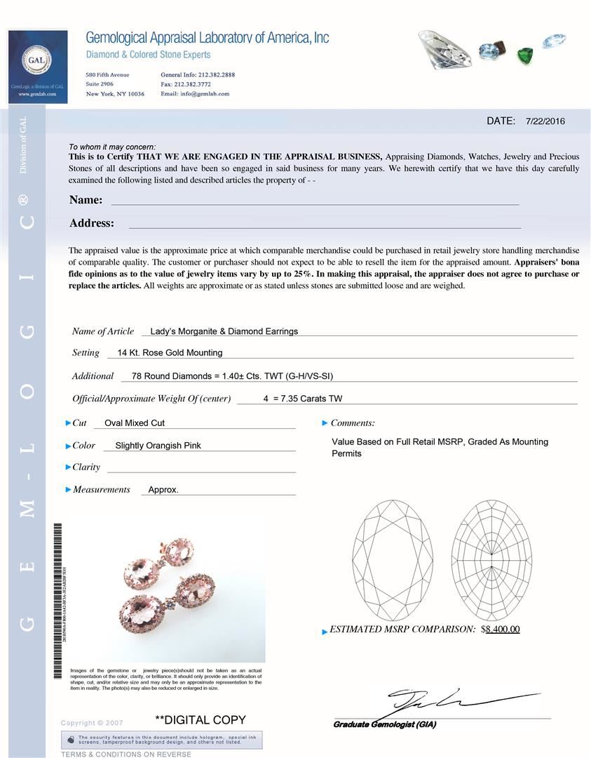 One pair of Lady's Morganite and Diamond earrings. Setting: 14 Kt. Rose Gold Mounting. Additional: 78 Round Diamonds = 1.40 Cts. TWT (G-H/VS-SI). Center Gem Stone Information: Variety: Morganite. Shape and Cut: Oval Mixed Cut. Measurements: Approx. Weight: 7.35 Carats. Color Hue: Slightly Orangish Pink. Total Weight: 3.22 grams.