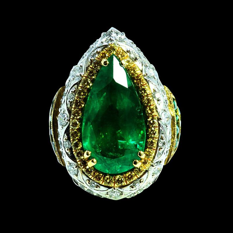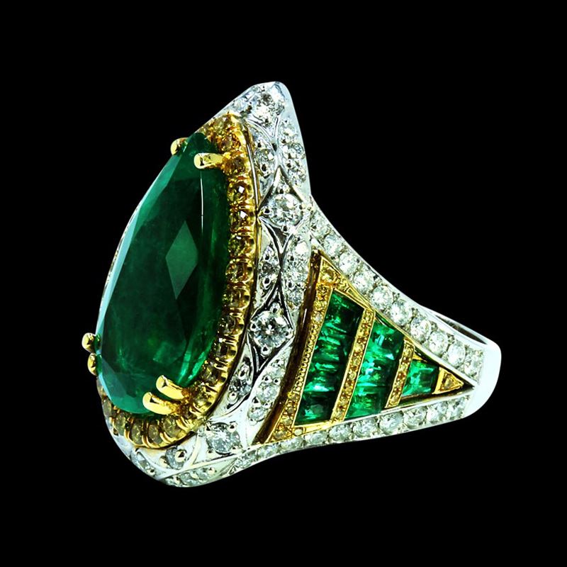 18K WHITE AND YELLOW NATURAL GOLD COLUMBIAN EMERALD RING:14.6 GRAMS/WHITE DIAMOND:1.27 CT/COLUMBIAN EMERALD(MAINSTONE):7.35CT/COLUMBIAN EMERALD(SIDESTONE):1.04CT/YELLOW DIAMOND:0.58CT/#GVR1159