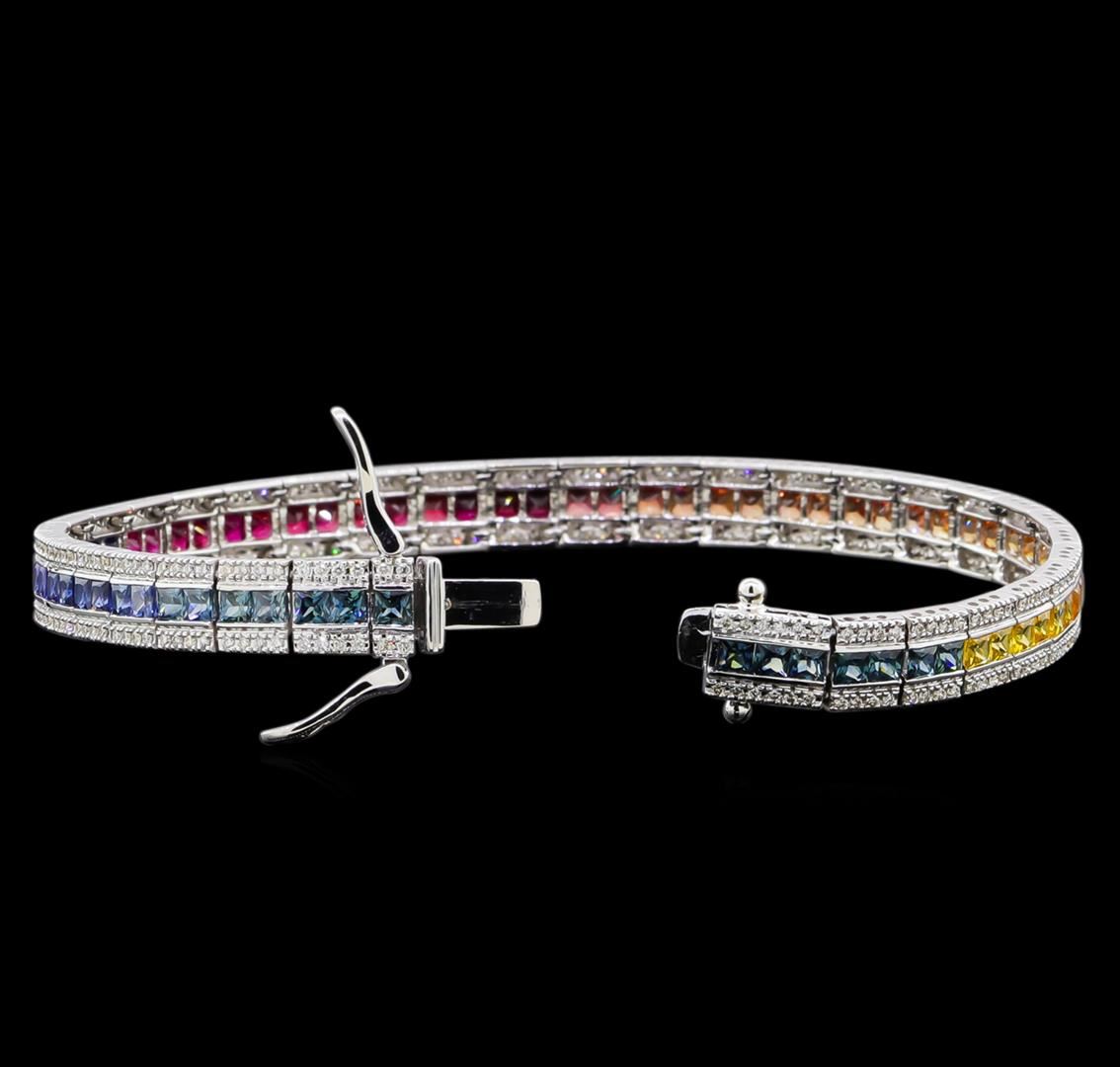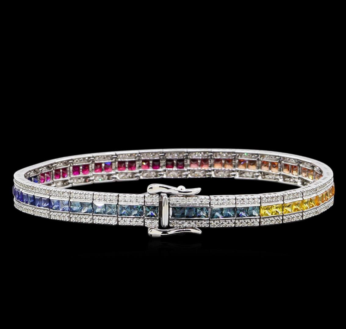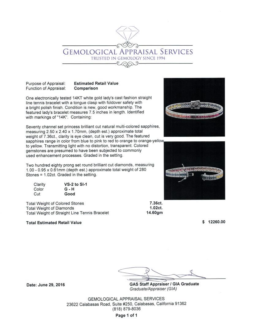 One electronically tested 14KT white gold lady's cast fashion straight line tennis bracelet with a tongue clasp with foldover safety with a bright polish finish. The featured lady's bracelet measures 7.5 inches in length. Identified with markings of "14K". Condition is new, good workmanship. Containing: Seventy channel set princess brilliant cut natural multi-colored sapphires, measuring 2.50 x 2.40 x 1.70mm, (depth est.) approximate total weight of 7.36ct., clarity is eye clean, cut is very good. The featured sapphires range in color from blue to pink to red to orange to orange-yellow to yellow. Transmitting light with no distortion, transparent. Colored gemstones are presumed to have been subjected to commonly used enhancement processes. Graded in the setting. Two Hundred Eighty prong set round brilliant cut diamonds, measuring 1.00 - 0.95 x 0.61mm (depth est.) approximate total weight of 280 Stones = 1.02ct. Graded in the setting. Clarity: VS-2 to SI-1. Color: G - Good. Total Weight of Colored Stones 7.36ct. Total Weight of Diamonds 1.02ct. Total Weight of Straight Line Tennis Bracelet 14.60gm. GAS Appraised at $12,260.00.
