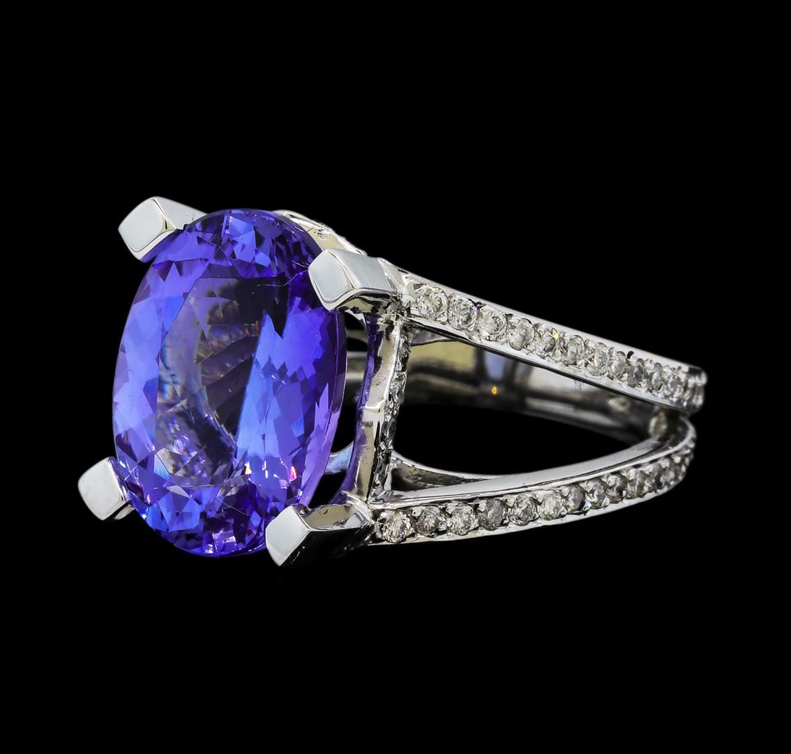 One electronically tested 14KT white gold lady's cast fashion ring with a split cathedral shank with a bright polish finish. The featured lady's ring has a double shank measuring 3.80 millimeters wide. Identified with markings of '14K'. Condition is new, good workmanship. Containing: One prong set oval modified brilliant cut natural tanzanite, measuring 14.20 x 10.65 x 6.52mm, (depth est.) 6%. bulge factor, approximate weight of 7.37ct., clarity is eye clean, medium, moderately strong, violet color, (GIA V 5/4), cut is good. Transmitting light with no distortion, transparent. Colored gemstones are presumed to have been subjected to commonly used enhancement processes. Graded in the setting. Seventy-Six bead set round brilliant cut diamonds, measuring 1.35 - 1.25 x 0.79mm (depth est.) approximate total weight of 76 Stones = 0.62ct. Graded in the setting. Clarity SI-1 to I-1. Color: G - H Cut Good. Total Weight of Colored Stones 7.37ct.. Total Weight of Diamonds 0.62ct.. Total Weight of Ring 8.60gm. GAS Appraised at $12,975.00.
