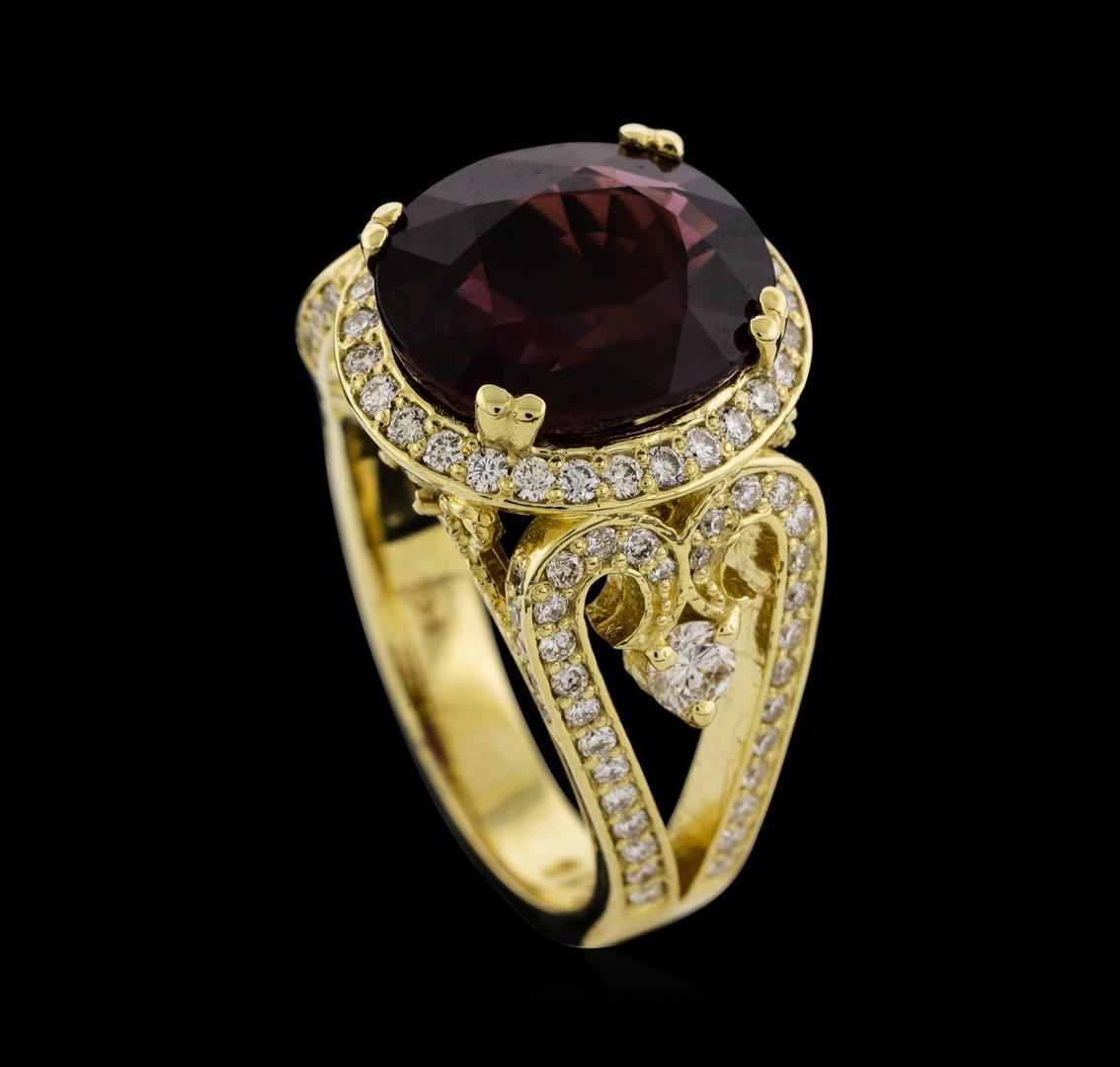 One electronically tested 14KT yellow gold lady's cast fashion ring with a cathedral split shank with a bright polish with milgrain detailing finish. The featured lady's ring has a shank measuring 3.70 millimeters wide. Identified with markings of '14K'. Condition is new, good workmanship. Containing: Four prong set round brilliant cut diamonds, measuring 3.20 - 3.10 x 1.95mm (depth est.) approximate total weight of 4 Stones = 0.50ct. Graded in the setting. Clarity SI-1. Color: H - I Cut Good One Hundred Eight prong set round brilliant cut diamonds, measuring 1.30 - 1.15 x 0.76mm (depth est.) approximate total weight of 108 Stones = 0.76ct. Graded in the setting. Clarity VS-2 to SI-2. Color: G - H Cut Good One prong set oval modified mixed cut natural rhodolite garnet, measuring 12.61 x 10.76 x 6.15mm, (depth est.) 10%. bulge factor, approximate weight of 7.38ct., clarity is eye clean, medium, moderately strong, strongly purplish red color, (GIA stpR 5/4), cut is very good. Transmitting light with no distortion, transparent. Colored gemstones are presumed to have been subjected to commonly used enhancement processes. Graded in the setting. Total Weight of Colored Stones 7.38ct.. Total Weight of Diamonds 1.26ct.. Total Weight of Ring 11.00gm. GAS Appraised at $7,090.00.