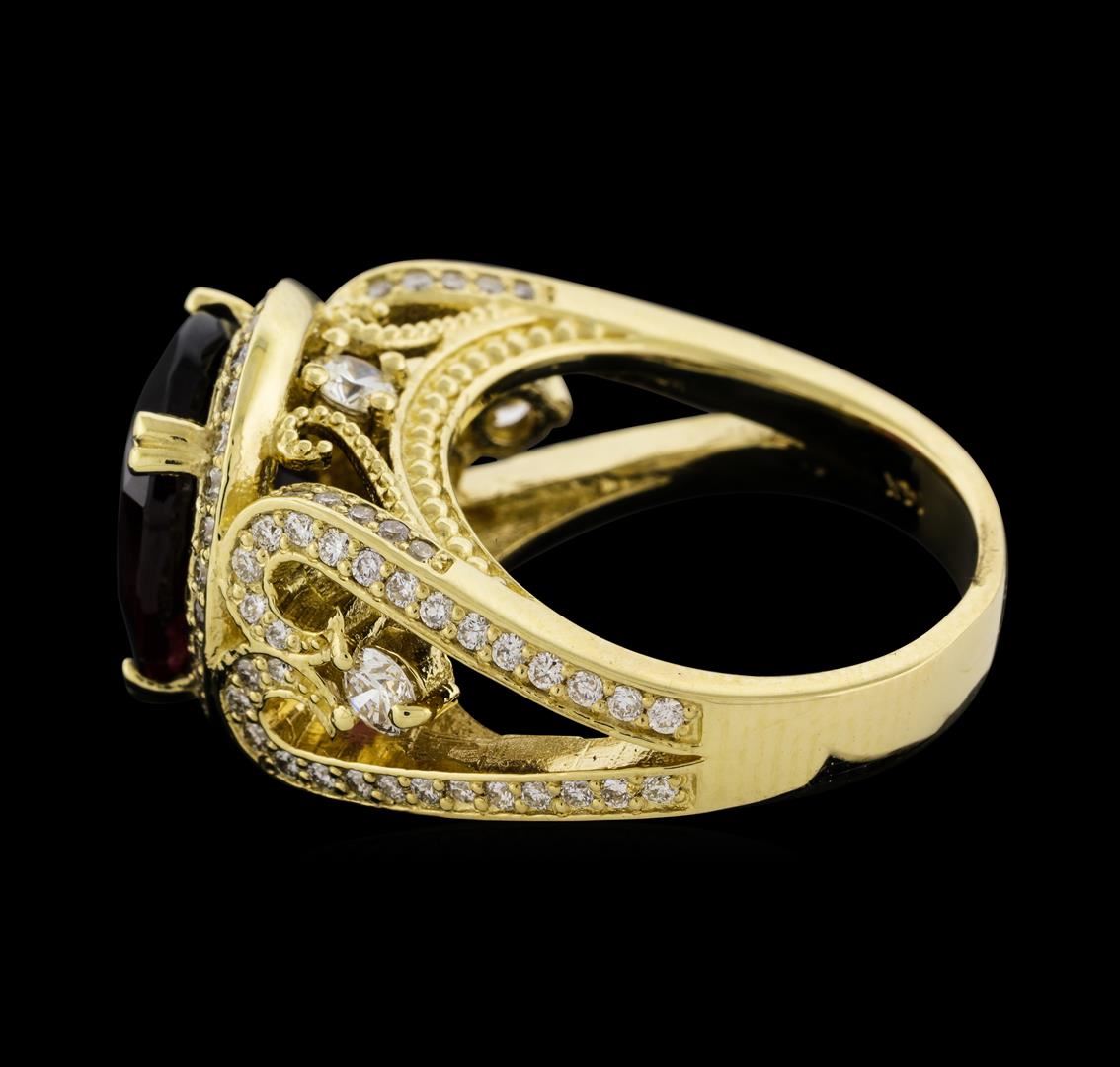 One electronically tested 14KT yellow gold lady's cast fashion ring with a cathedral split shank with a bright polish with milgrain detailing finish. The featured lady's ring has a shank measuring 3.70 millimeters wide. Identified with markings of '14K'. Condition is new, good workmanship. Containing: Four prong set round brilliant cut diamonds, measuring 3.20 - 3.10 x 1.95mm (depth est.) approximate total weight of 4 Stones = 0.50ct. Graded in the setting. Clarity SI-1. Color: H - I Cut Good One Hundred Eight prong set round brilliant cut diamonds, measuring 1.30 - 1.15 x 0.76mm (depth est.) approximate total weight of 108 Stones = 0.76ct. Graded in the setting. Clarity VS-2 to SI-2. Color: G - H Cut Good One prong set oval modified mixed cut natural rhodolite garnet, measuring 12.61 x 10.76 x 6.15mm, (depth est.) 10%. bulge factor, approximate weight of 7.38ct., clarity is eye clean, medium, moderately strong, strongly purplish red color, (GIA stpR 5/4), cut is very good. Transmitting light with no distortion, transparent. Colored gemstones are presumed to have been subjected to commonly used enhancement processes. Graded in the setting. Total Weight of Colored Stones 7.38ct.. Total Weight of Diamonds 1.26ct.. Total Weight of Ring 11.00gm. GAS Appraised at $7,090.00.