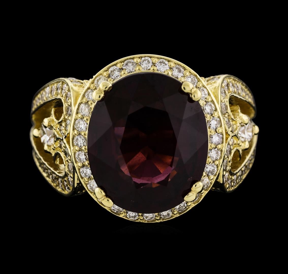 One electronically tested 14KT yellow gold lady's cast fashion ring with a cathedral split shank with a bright polish with milgrain detailing finish. The featured lady's ring has a shank measuring 3.70 millimeters wide. Identified with markings of '14K'. Condition is new, good workmanship. Containing: Four prong set round brilliant cut diamonds, measuring 3.20 - 3.10 x 1.95mm (depth est.) approximate total weight of 4 Stones = 0.50ct. Graded in the setting. Clarity SI-1. Color: H - I Cut Good One Hundred Eight prong set round brilliant cut diamonds, measuring 1.30 - 1.15 x 0.76mm (depth est.) approximate total weight of 108 Stones = 0.76ct. Graded in the setting. Clarity VS-2 to SI-2. Color: G - H Cut Good One prong set oval modified mixed cut natural rhodolite garnet, measuring 12.61 x 10.76 x 6.15mm, (depth est.) 10%. bulge factor, approximate weight of 7.38ct., clarity is eye clean, medium, moderately strong, strongly purplish red color, (GIA stpR 5/4), cut is very good. Transmitting light with no distortion, transparent. Colored gemstones are presumed to have been subjected to commonly used enhancement processes. Graded in the setting. Total Weight of Colored Stones 7.38ct.. Total Weight of Diamonds 1.26ct.. Total Weight of Ring 11.00gm. GAS Appraised at $7,090.00.