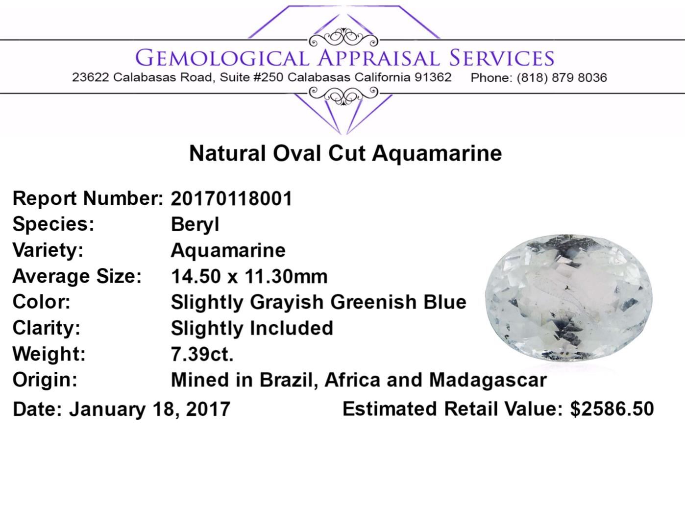 One natural oval cut aquamarine with an exact weight of 7.39ct., clarity is slightly included, slightly grayish greenish blue. Gemological Appraisals Services estimates the retail value at $2586.5 GAS Appraised.