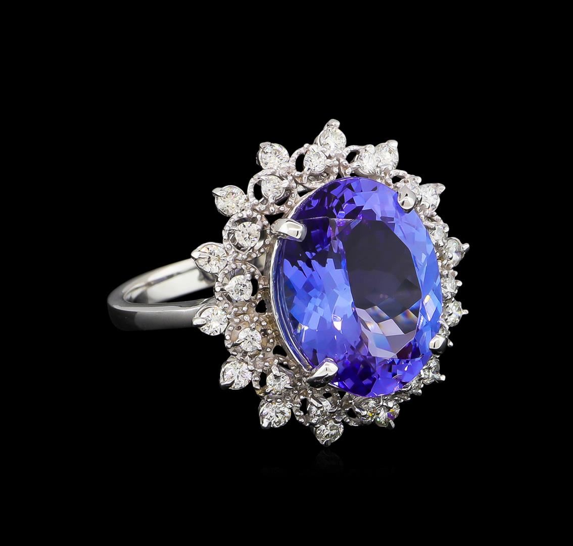 One electronically tested 14KT white gold lady's cast fashion ring with a basket double halo with a bright polish with milgrain detailing finish. The featured lady's ring has a shank measuring 2.37 millimeters wide. Identified with markings of "K14". Condition is new, good workmanship. Containing: One prong set oval modified brilliant cut natural tanzanite, measuring 14.48 x 11.54 x 6.00mm, 5%. bulge factor, approximate weight of 7.40ct., clarity is eye clean, type I, medium, moderately strong, bluish violet color, (GIA bV 5/4), cut is very good. Transmitting light with no distortion, transparent. Colored gemstones are presumed to have been subjected to commonly used enhancement processes. Graded in the setting. Fourteen prong set round brilliant cut diamonds, measuring 1.90 - 1.80 x 1.17mm (depth est.) approximate total weight of 14 Stones = 0.35ct. Graded in the setting. Clarity: SI-1 to SI-2. Color: H - I. Cut Very Good Fourteen prong set round brilliant cut diamonds, measuring 1.60 - 1.50 x 0.98mm (depth est.) approximate total weight of 14 Stones = 0.21ct. Graded in the setting. Clarity: SI-1 to SI-2. Color: H - I. Cut Good. Total Weight of Colored Stones 7.40ct. Total Weight of Diamonds 0.56ct. Total Weight of Ring 6.40gm. GAS Appraised at $13,640.00.