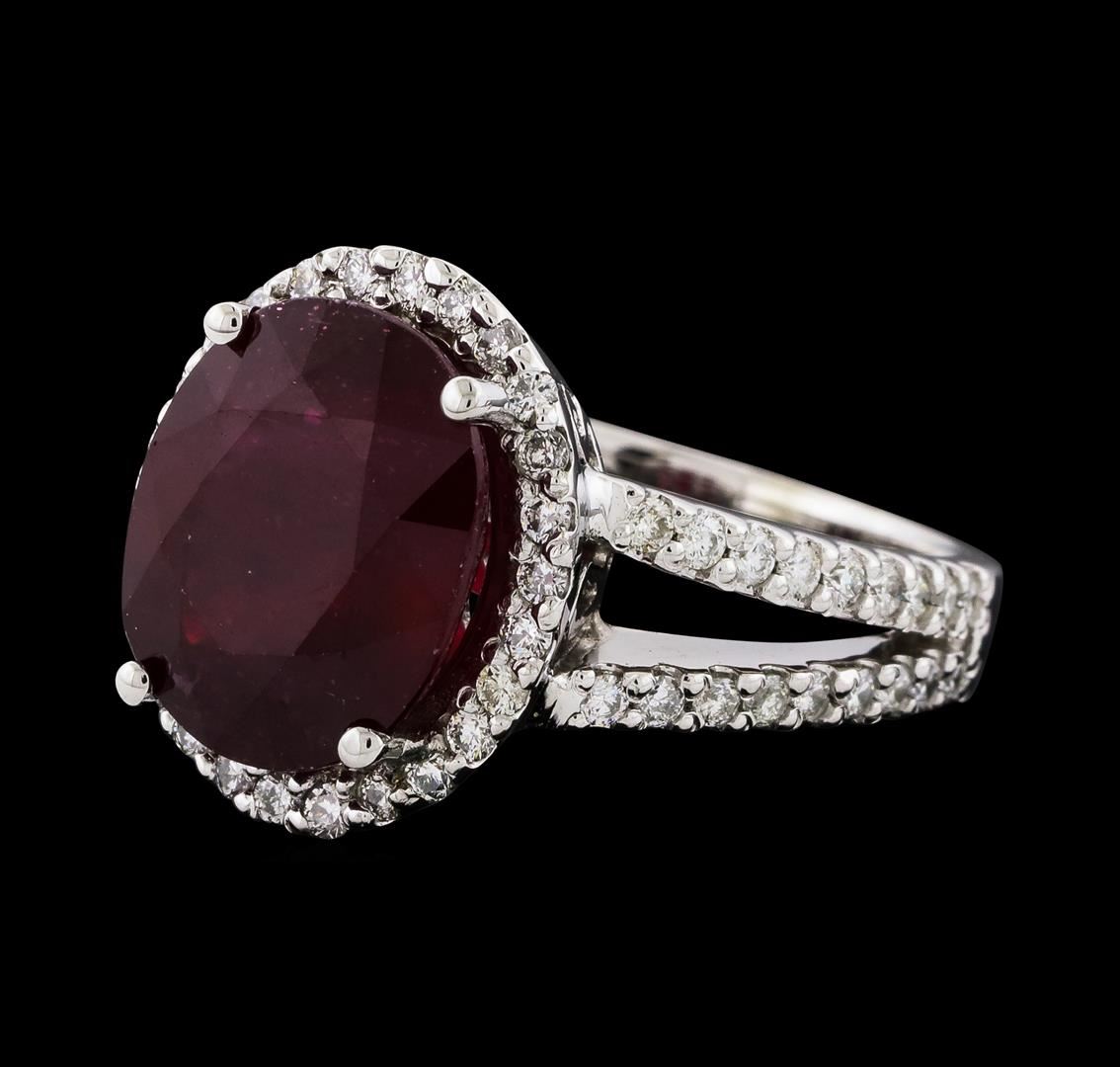 One electronically tested 14KT white gold lady's cast fashion ring with a split shank halo with a bright polish finish. The featured lady's ring has a shank measuring 2.66 millimeters wide. Identified with markings of '14K'. Condition is new, good workmanship. Containing: One prong set oval modified mixed cut natural ruby, measuring 12.36 x 10.14 x 6.63mm, (depth est.) 5%. bulge factor, approximate weight of 7.41ct., clarity is heavily included, dark, strong, red color, (GIA R 7/5), cut is good. Transmitting light somewhat diffusely, semi-transparent to translucent. Naturally occurring internal & external characteristics are present. Indications of laboratory high temperature heat treatment, with glass & flux additives. Colored gemstones are presumed to have been subjected to commonly used enhancement processes. Graded in the setting. Sixty-Two prong set round brilliant cut diamonds, measuring 1.50 - 1.40 x 0.90mm (depth est.) approximate total weight of 62 Stones = 0.73ct. Graded in the setting. Clarity SI-1 to I-1. Color: G - I Cut Good. Total Weight of Colored Stones 7.41ct.. Total Weight of Diamonds 0.73ct.. Total Weight of Ring 8.40gm. GAS Appraised at $7,155.00.