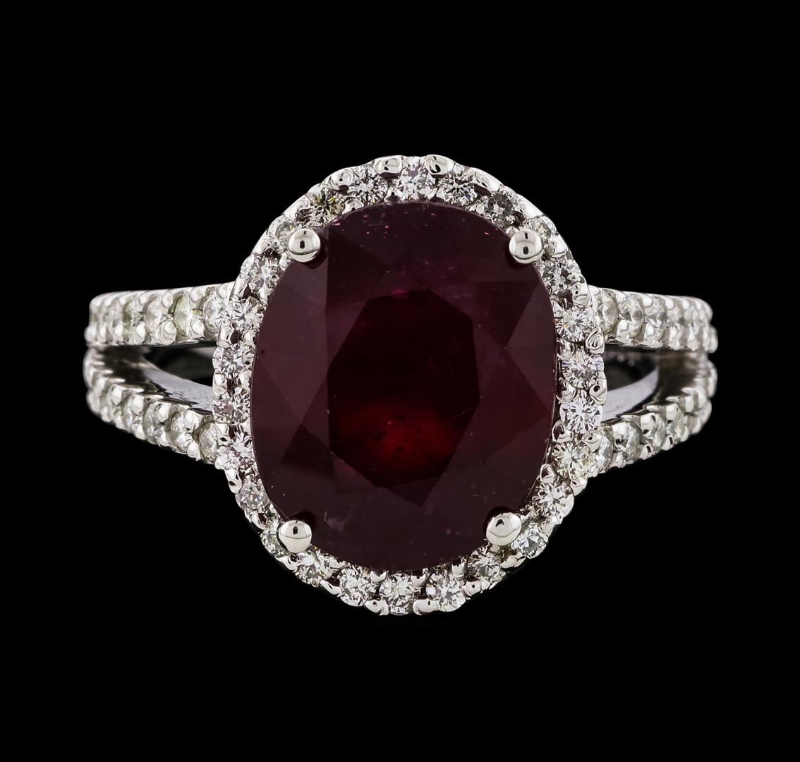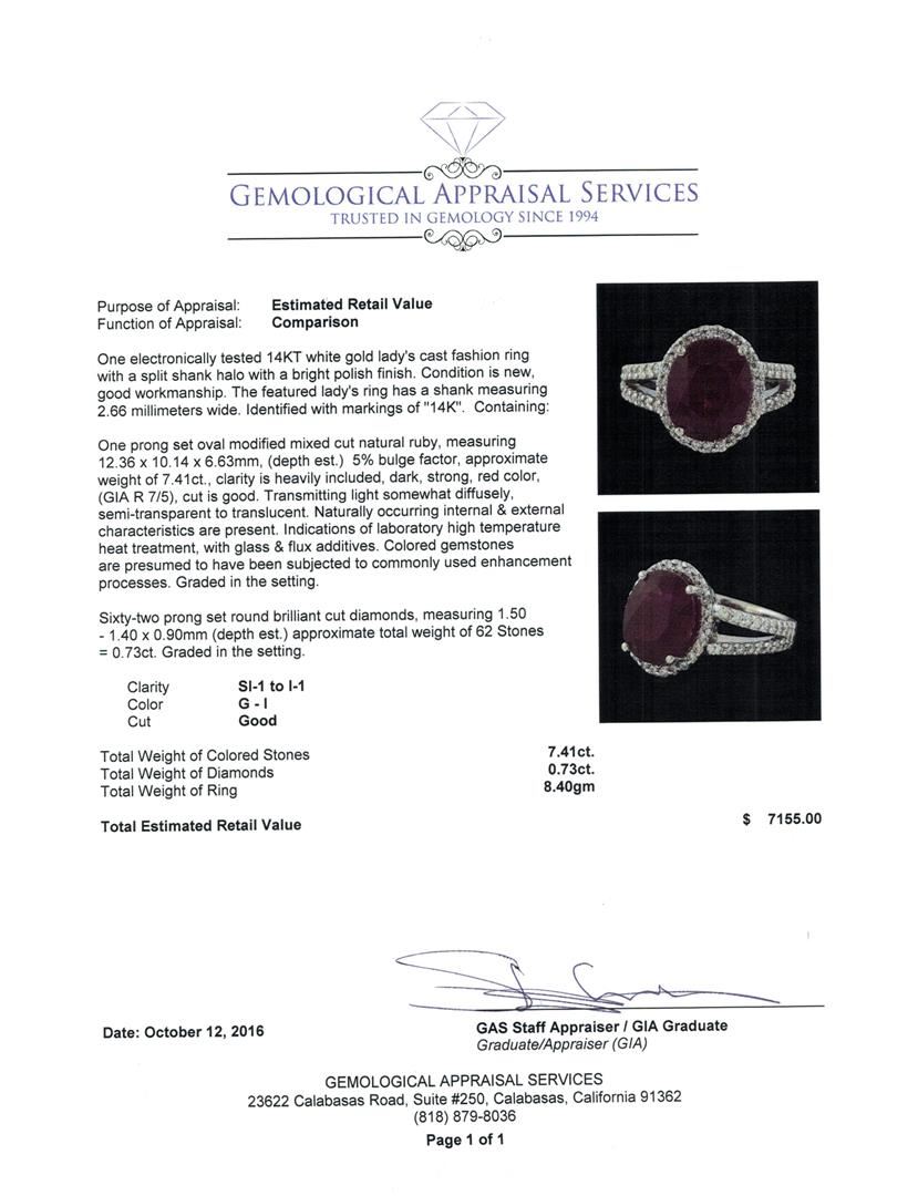 One electronically tested 14KT white gold lady's cast fashion ring with a split shank halo with a bright polish finish. The featured lady's ring has a shank measuring 2.66 millimeters wide. Identified with markings of '14K'. Condition is new, good workmanship. Containing: One prong set oval modified mixed cut natural ruby, measuring 12.36 x 10.14 x 6.63mm, (depth est.) 5%. bulge factor, approximate weight of 7.41ct., clarity is heavily included, dark, strong, red color, (GIA R 7/5), cut is good. Transmitting light somewhat diffusely, semi-transparent to translucent. Naturally occurring internal & external characteristics are present. Indications of laboratory high temperature heat treatment, with glass & flux additives. Colored gemstones are presumed to have been subjected to commonly used enhancement processes. Graded in the setting. Sixty-Two prong set round brilliant cut diamonds, measuring 1.50 - 1.40 x 0.90mm (depth est.) approximate total weight of 62 Stones = 0.73ct. Graded in the setting. Clarity SI-1 to I-1. Color: G - I Cut Good. Total Weight of Colored Stones 7.41ct.. Total Weight of Diamonds 0.73ct.. Total Weight of Ring 8.40gm. GAS Appraised at $7,155.00.