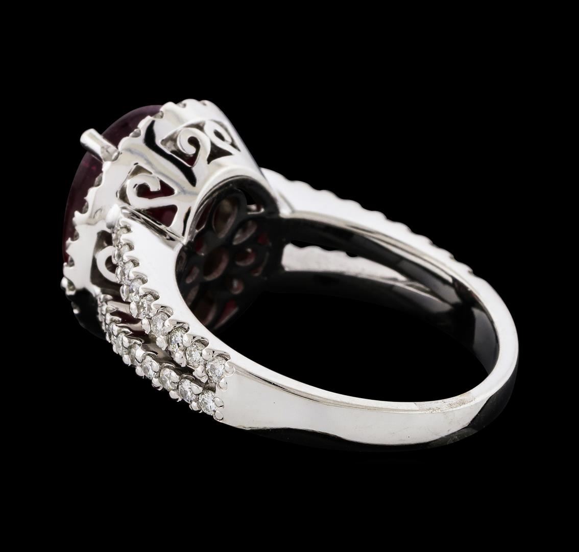One electronically tested 14KT white gold lady's cast fashion ring with a split shank halo with a bright polish finish. The featured lady's ring has a shank measuring 2.66 millimeters wide. Identified with markings of '14K'. Condition is new, good workmanship. Containing: One prong set oval modified mixed cut natural ruby, measuring 12.36 x 10.14 x 6.63mm, (depth est.) 5%. bulge factor, approximate weight of 7.41ct., clarity is heavily included, dark, strong, red color, (GIA R 7/5), cut is good. Transmitting light somewhat diffusely, semi-transparent to translucent. Naturally occurring internal & external characteristics are present. Indications of laboratory high temperature heat treatment, with glass & flux additives. Colored gemstones are presumed to have been subjected to commonly used enhancement processes. Graded in the setting. Sixty-Two prong set round brilliant cut diamonds, measuring 1.50 - 1.40 x 0.90mm (depth est.) approximate total weight of 62 Stones = 0.73ct. Graded in the setting. Clarity SI-1 to I-1. Color: G - I Cut Good. Total Weight of Colored Stones 7.41ct.. Total Weight of Diamonds 0.73ct.. Total Weight of Ring 8.40gm. GAS Appraised at $7,155.00.