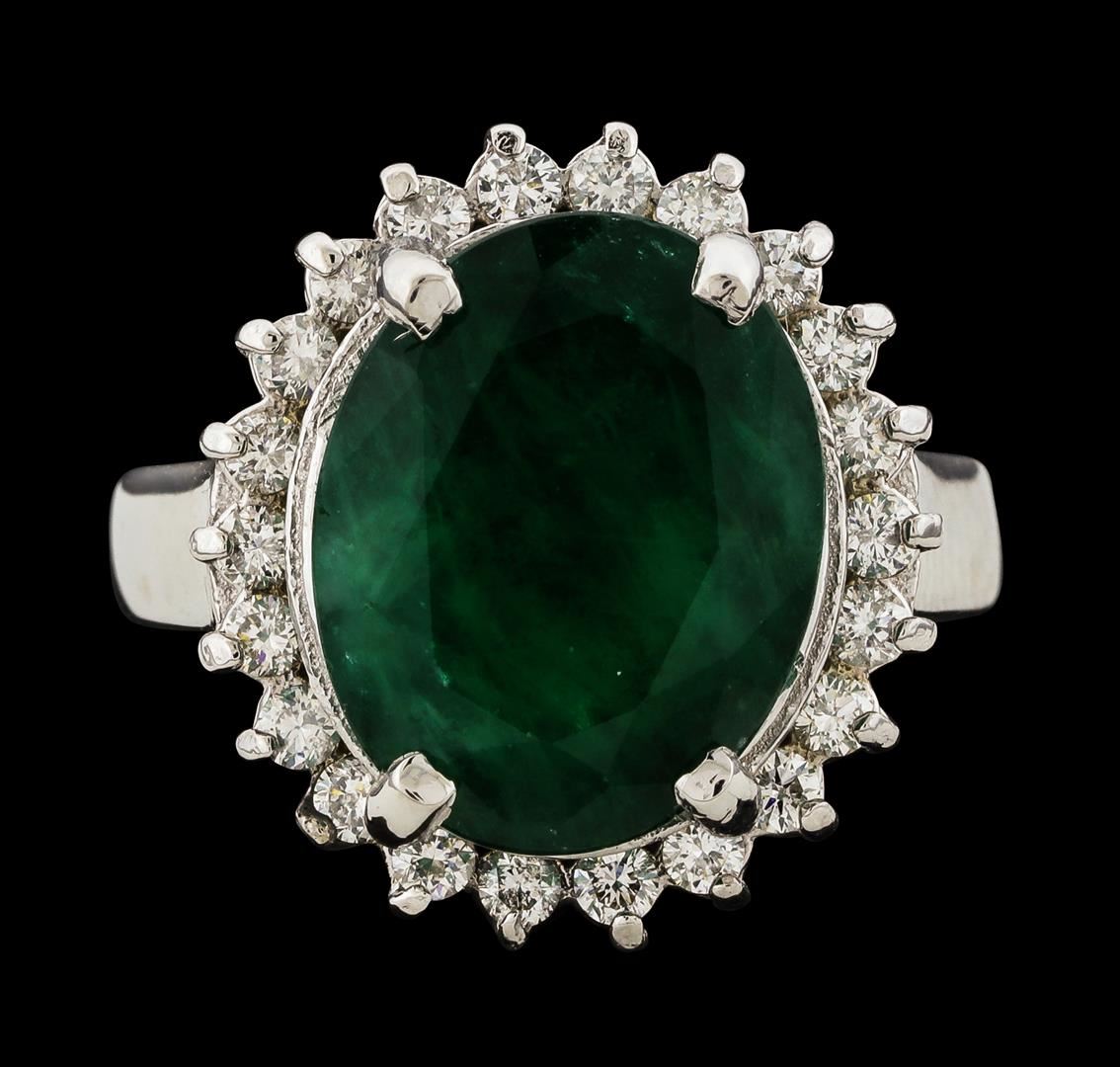 One electronically tested 14KT white gold lady's cast fashion ring with a basket halo with a bright polish finish. The featured lady's ring has a shank measuring 2.80 millimeters wide. Identified with markings of '14K'. Condition is new, good workmanship. Containing: One prong set oval modified mixed cut natural emerald, measuring 14.15 x 11.14 x 7.28mm, (depth est.) 13%. bulge factor, approximate weight of 7.42ct., clarity is heavily included, medium dark, moderately strong, green color, (GIA G 6/4), cut is good. Transmitting light somewhat diffusely, semi-transparent to translucent. Naturally occurring internal & external characteristics are present. Indications of oil residue. Colored gemstones are presumed to have been subjected to commonly used enhancement processes. Graded in the setting. Twenty-Two prong set round brilliant cut diamonds, measuring 1.95 - 1.85 x 1.16mm (depth est.) approximate total weight of 22 Stones = 0.56ct. Graded in the setting. Clarity VS-2 to SI-2. Color: G - H Cut Good. Total Weight of Colored Stones 7.42ct.. Total Weight of Diamonds 0.56ct.. Total Weight of Ring 7.50gm GAS Appraised at $8,865.00.