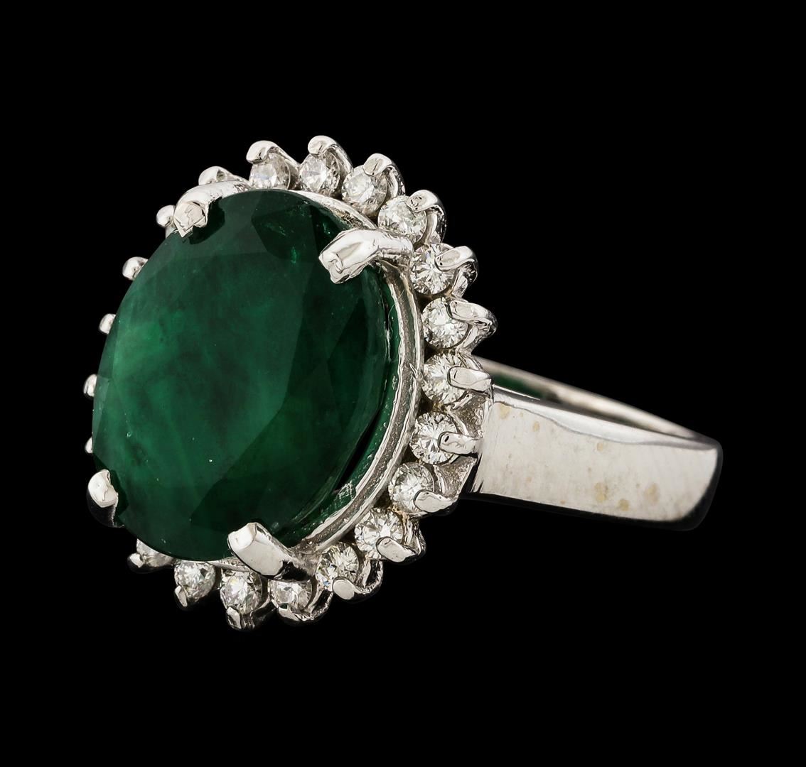 One electronically tested 14KT white gold lady's cast fashion ring with a basket halo with a bright polish finish. The featured lady's ring has a shank measuring 2.80 millimeters wide. Identified with markings of '14K'. Condition is new, good workmanship. Containing: One prong set oval modified mixed cut natural emerald, measuring 14.15 x 11.14 x 7.28mm, (depth est.) 13%. bulge factor, approximate weight of 7.42ct., clarity is heavily included, medium dark, moderately strong, green color, (GIA G 6/4), cut is good. Transmitting light somewhat diffusely, semi-transparent to translucent. Naturally occurring internal & external characteristics are present. Indications of oil residue. Colored gemstones are presumed to have been subjected to commonly used enhancement processes. Graded in the setting. Twenty-Two prong set round brilliant cut diamonds, measuring 1.95 - 1.85 x 1.16mm (depth est.) approximate total weight of 22 Stones = 0.56ct. Graded in the setting. Clarity VS-2 to SI-2. Color: G - H Cut Good. Total Weight of Colored Stones 7.42ct.. Total Weight of Diamonds 0.56ct.. Total Weight of Ring 7.50gm GAS Appraised at $8,865.00.