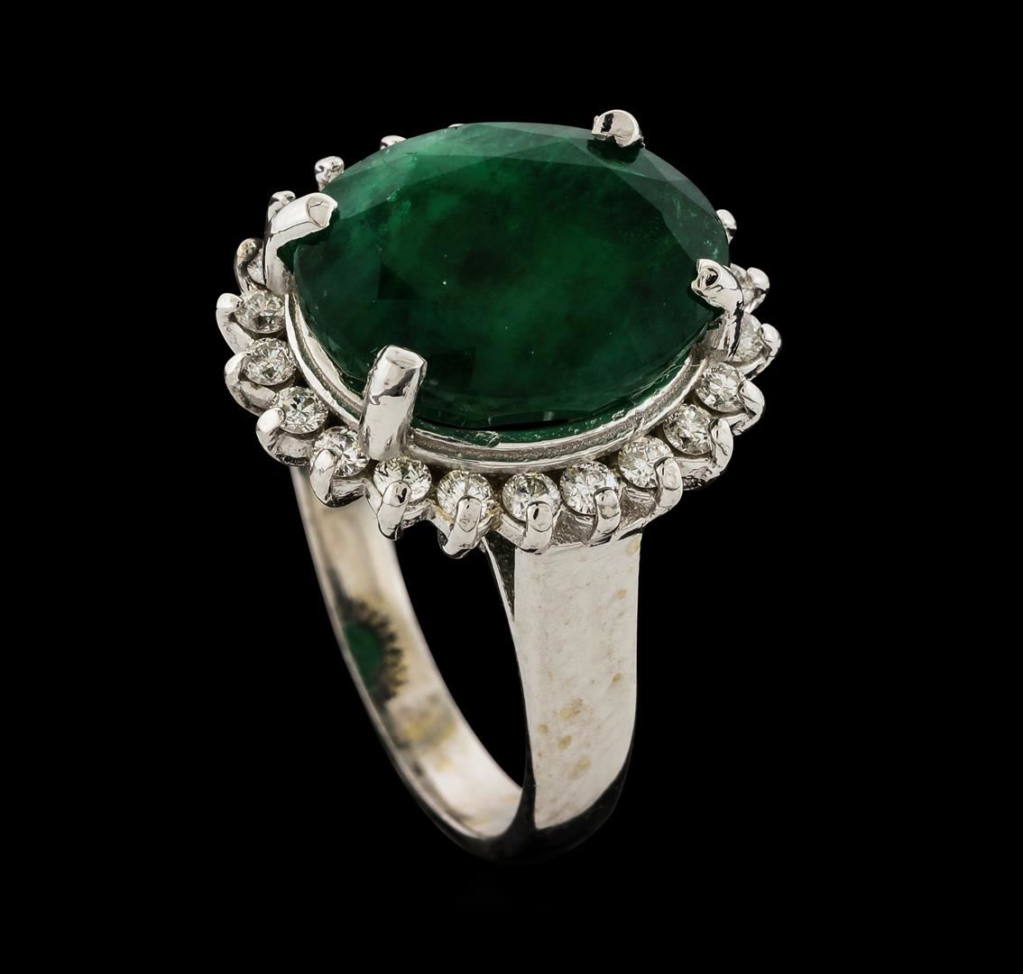 One electronically tested 14KT white gold lady's cast fashion ring with a basket halo with a bright polish finish. The featured lady's ring has a shank measuring 2.80 millimeters wide. Identified with markings of '14K'. Condition is new, good workmanship. Containing: One prong set oval modified mixed cut natural emerald, measuring 14.15 x 11.14 x 7.28mm, (depth est.) 13%. bulge factor, approximate weight of 7.42ct., clarity is heavily included, medium dark, moderately strong, green color, (GIA G 6/4), cut is good. Transmitting light somewhat diffusely, semi-transparent to translucent. Naturally occurring internal & external characteristics are present. Indications of oil residue. Colored gemstones are presumed to have been subjected to commonly used enhancement processes. Graded in the setting. Twenty-Two prong set round brilliant cut diamonds, measuring 1.95 - 1.85 x 1.16mm (depth est.) approximate total weight of 22 Stones = 0.56ct. Graded in the setting. Clarity VS-2 to SI-2. Color: G - H Cut Good. Total Weight of Colored Stones 7.42ct.. Total Weight of Diamonds 0.56ct.. Total Weight of Ring 7.50gm GAS Appraised at $8,865.00.
