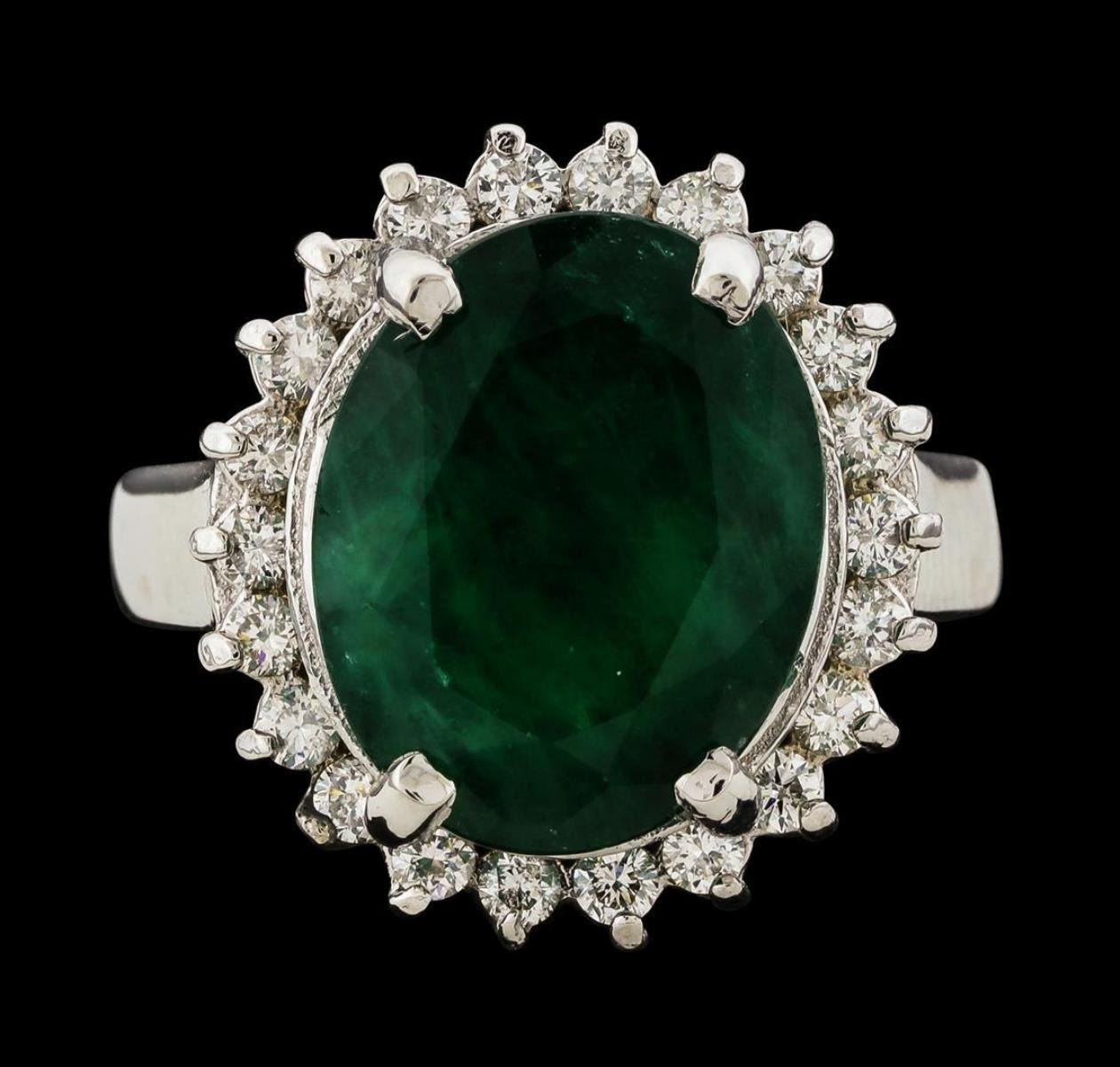 One electronically tested 14KT white gold lady's cast fashion ring with a basket halo with a bright polish finish. The featured lady's ring has a shank measuring 2.80 millimeters wide. Identified with markings of '14K'. Condition is new, good workmanship. Containing: One prong set oval modified mixed cut natural emerald, measuring 14.15 x 11.14 x 7.28mm, (depth est.) 13%. bulge factor, approximate weight of 7.42ct., clarity is heavily included, medium dark, moderately strong, green color, (GIA G 6/4), cut is good. Transmitting light somewhat diffusely, semi-transparent to translucent. Naturally occurring internal & external characteristics are present. Indications of oil residue. Colored gemstones are presumed to have been subjected to commonly used enhancement processes. Graded in the setting. Twenty-Two prong set round brilliant cut diamonds, measuring 1.95 - 1.85 x 1.16mm (depth est.) approximate total weight of 22 Stones = 0.56ct. Graded in the setting. Clarity VS-2 to SI-2. Color: G - H Cut Good. Total Weight of Colored Stones 7.42ct.. Total Weight of Diamonds 0.56ct.. Total Weight of Ring 7.50gm GAS Appraised.