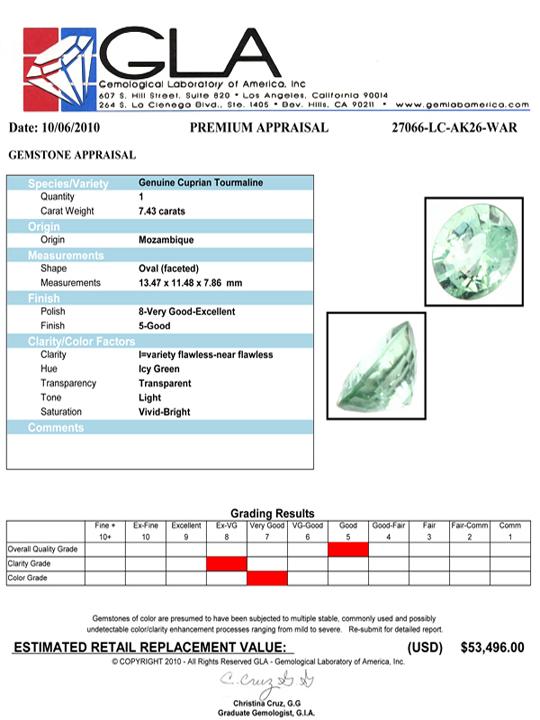 Excellent icy green color RARE copper-bearing specimen oval cut: COPPER in tourmaline is rare and highly prized, it makes the stone color much more vivid (sometimes neon-like) and causes the stone to mimick the reflectivity of diamond; lab quality evaluation 7; treatment as noted; Gem Guide wholesale $7430-$13003; full retail appraisal $53496; full lab evaluation included