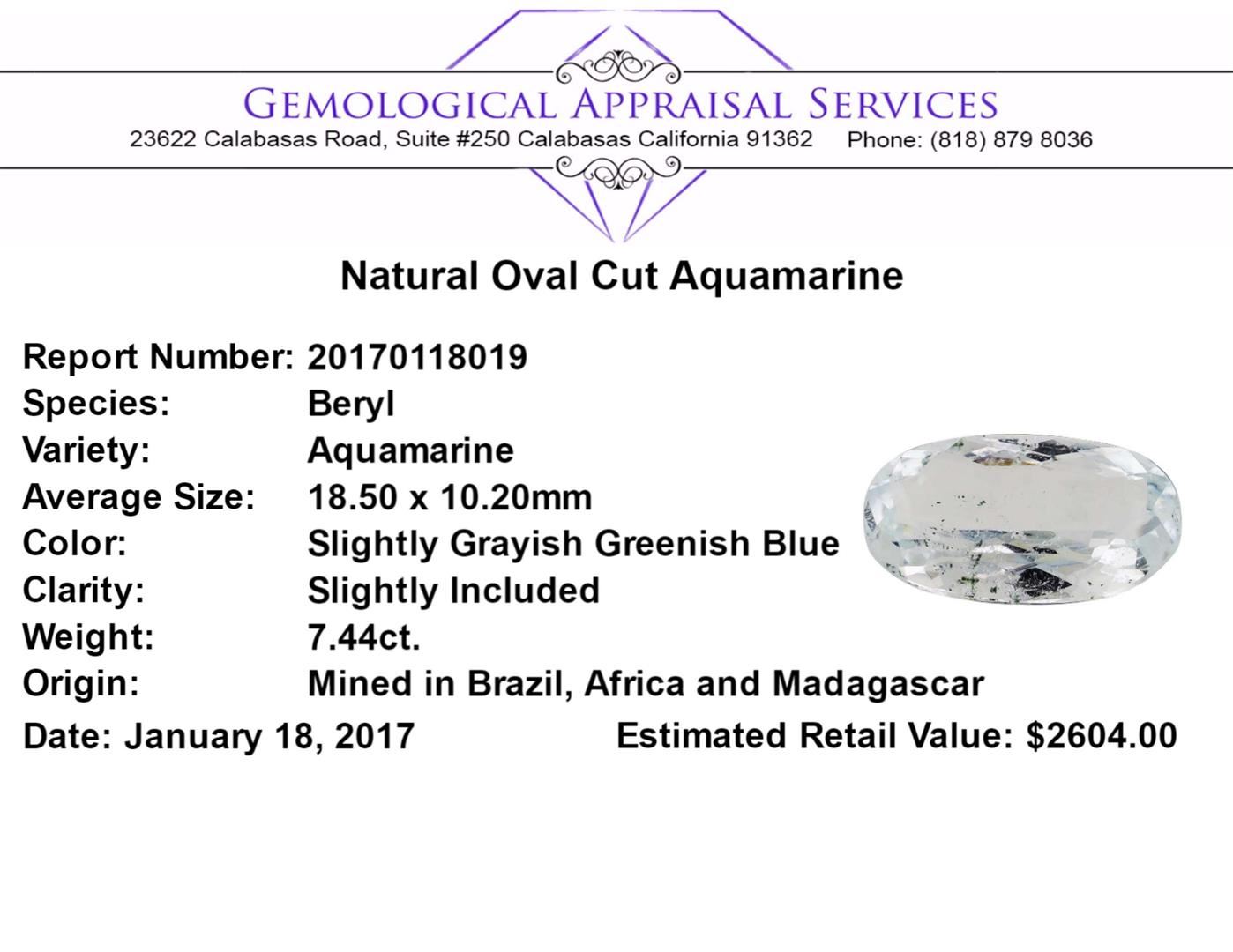 One natural oval cut aquamarine with an exact weight of 7.44ct., clarity is slightly included, slightly grayish greenish blue. Gemological Appraisals Services estimates the retail value at $2604 GAS Appraised.