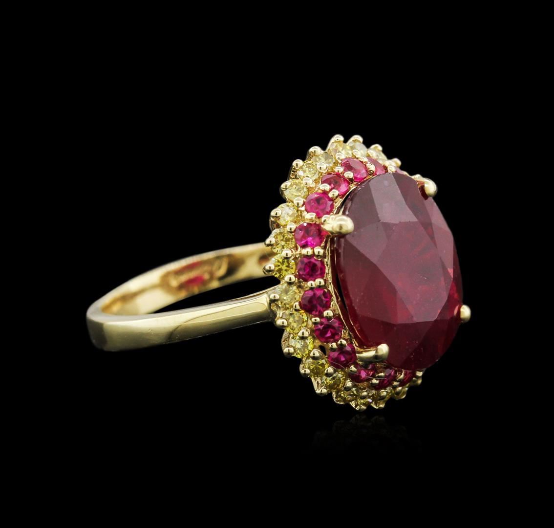 One electronically tested yellow gold ladies cast ruby and diamond ring with a bright polish finish. Condition is new, good workmanship. The featured ruby is set within an inner ruby and outer diamond bezel, completed by a two and one half millimeter wide band. Trademark is Orianne. Identified with markings of " 14K". Containing: One prong set oval mixed cut natural ruby, measuring 13.10x11.00 x 5.00mm, 8% bulge factor, approximate weight of 6.78ct., clarity is heavily included, type II, medium dark, moderately strong, slightly purplish red color,(GIA slpR 6/4), cut is good. Transmitting light somewhat diffusely, transparent to translucent. Naturally occurring internal & external characteristics are present. Indications of laboratory high temperature heat treatment, with glass& flux additives. Graded in the setting. Twenty prong set round brilliant cut natural rubies, measuring 2.00 - 1.90 x 1.27 mm, approximate total weight of 0.66ct., clarity is eye clean, type II, medium dark, moderately strong, slightly purplish red color, (GIA slpR 6/4),cut is good. Transmitting light with no distortion, transparent. Color grade is an average for the group. Graded in the setting. Ruby has a low tolerance to rhodium plating, repolishing the surface, & ultrasonic cleaning. Twenty-eight prong set round brilliant cut diamonds, measuring 1.70 - 1.60 x 0.99mm (depth est.) approximate total weight of 28 Stones = 0.56ct. These diamonds are commonly irradiated in a laboratory to enhance the color. Evidence that may confirm this is typically lacking. Color grade is an average for the group. Graded in the setting. Clarity: SI-2 to 1-2. Color: Light Yellow. AIG Appraised at $4,015.00.