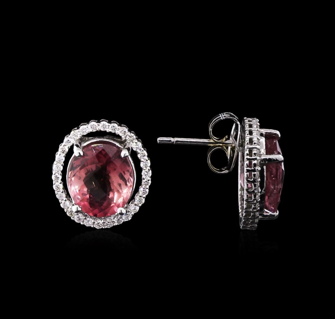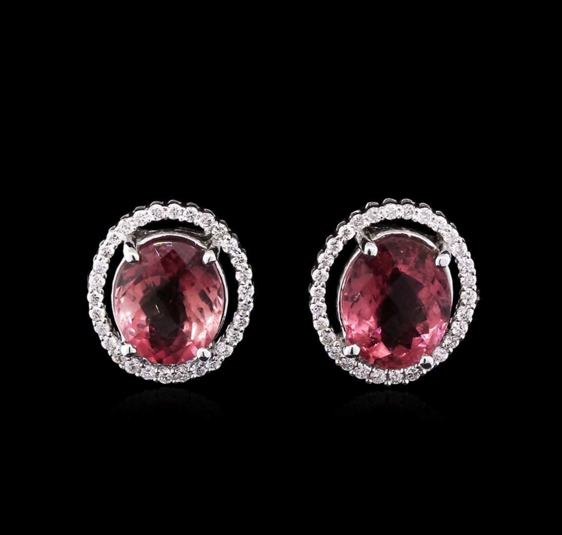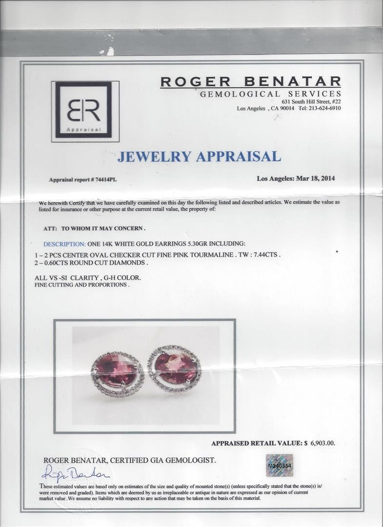 One pair of 14KT white gold earrings weighing 5.30 grams including: 2 center oval checker cut fine pink tourmaline with a total weight of 7.44ct and round cut diamonds with a total weight of 0.60ct. All VS-SI clarity, G-H color. Fine cutting and proportions. RBGS Appraised at $6,903.00.
