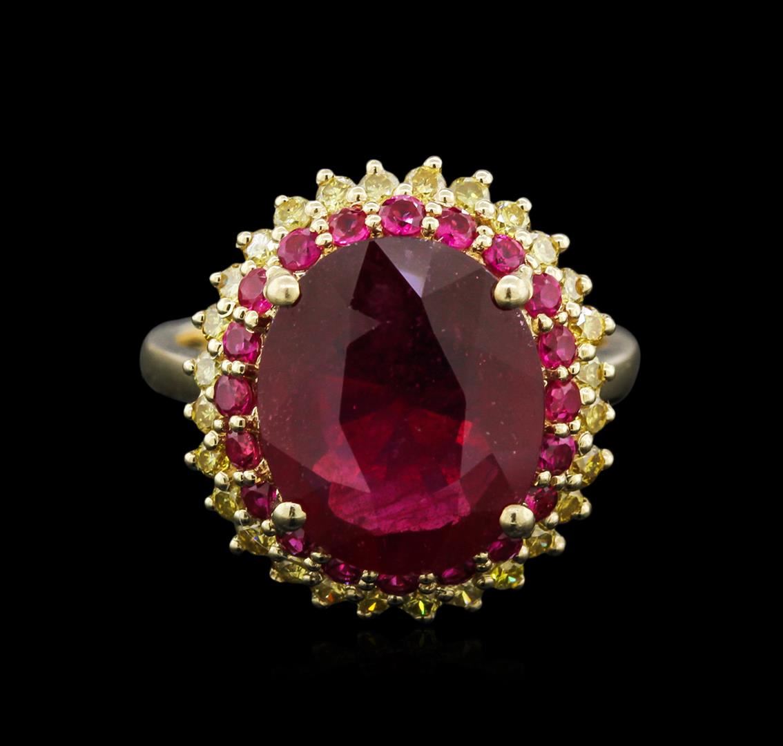 One electronically tested yellow gold ladies cast ruby and diamond ring with a bright polish finish. Condition is new, good workmanship. The featured ruby is set within an inner ruby and outer diamond bezel, completed by a two and one half millimeter wide band. Trademark is Orianne. Identified with markings of " 14K". Containing: One prong set oval mixed cut natural ruby, measuring 13.10x11.00 x 5.00mm, 8% bulge factor, approximate weight of 6.78ct., clarity is heavily included, type II, medium dark, moderately strong, slightly purplish red color,(GIA slpR 6/4), cut is good. Transmitting light somewhat diffusely, transparent to translucent. Naturally occurring internal & external characteristics are present. Indications of laboratory high temperature heat treatment, with glass& flux additives. Graded in the setting. Twenty prong set round brilliant cut natural rubies, measuring 2.00 - 1.90 x 1.27 mm, approximate total weight of 0.66ct., clarity is eye clean, type II, medium dark, moderately strong, slightly purplish red color, (GIA slpR 6/4),cut is good. Transmitting light with no distortion, transparent. Color grade is an average for the group. Graded in the setting. Ruby has a low tolerance to rhodium plating, repolishing the surface, & ultrasonic cleaning. Twenty-eight prong set round brilliant cut diamonds, measuring 1.70 - 1.60 x 0.99mm (depth est.) approximate total weight of 28 Stones = 0.56ct. These diamonds are commonly irradiated in a laboratory to enhance the color. Evidence that may confirm this is typically lacking. Color grade is an average for the group. Graded in the setting. Clarity: SI-2 to 1-2. Color: Light Yellow. AIG Appraised at $4,015.00.