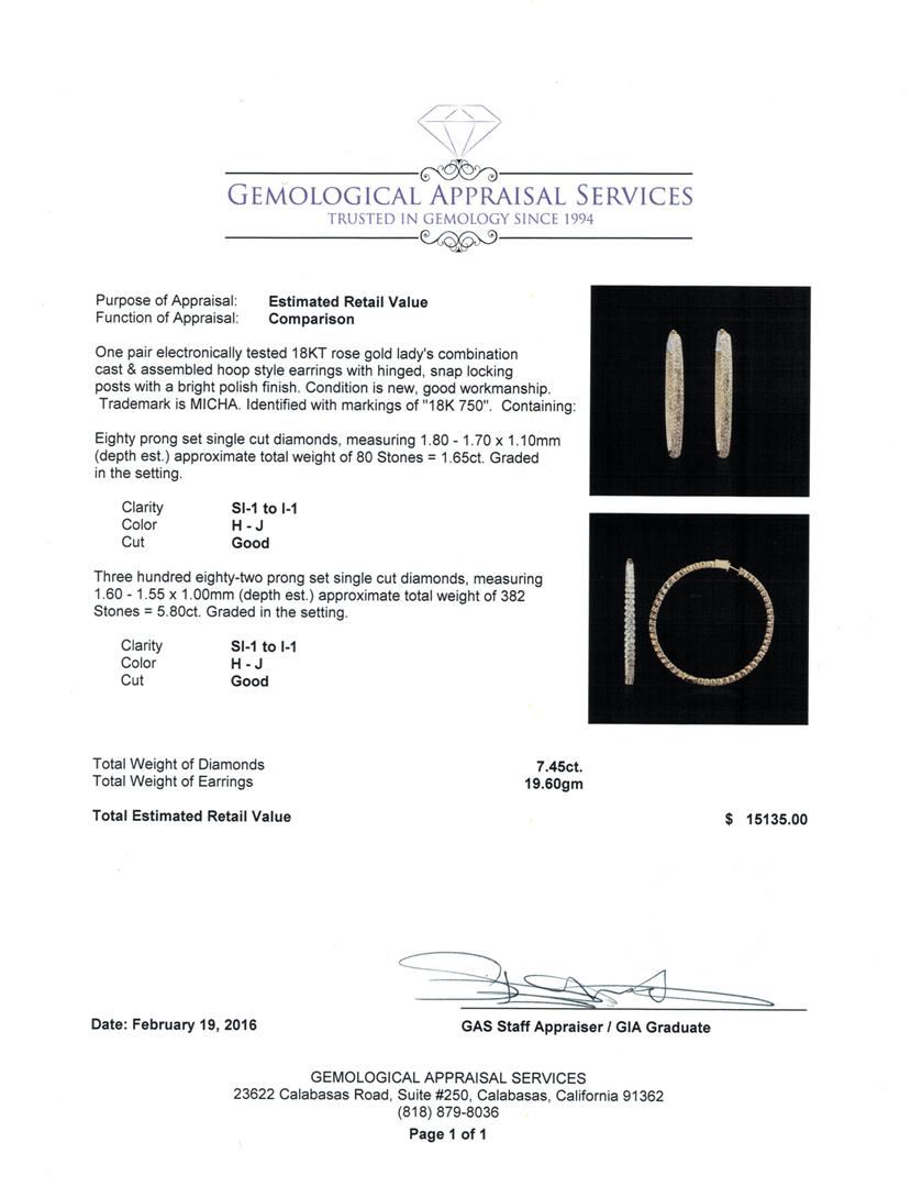 One pair electronically tested 18KT rose gold lady's combination cast & assembled hoop style earrings with hinged, snap locking posts with a bright polish finish. Trademark is MICHA. Identified with markings of "18K 750". Condition is new, good workmanship. Containing: Eighty prong set single cut diamonds, measuring 1.80 - 1.70 x 1.10mm (depth est.) approximate total weight of 80 Stones = 1.65ct. Graded in the setting. Clarity: SI-1 to I-1. Color: H - Good Three Hundred Eighty-Two prong set single cut diamonds, measuring 1.60 - 1.55 x 1.00mm (depth est.) approximate total weight of 382 Stones = 5.80ct. Graded in the setting. Clarity: SI-1 to I-1. Color: H - Good. Total Weight of Diamonds 7.45ct. Total Weight of Earrings 19.60gm. GAS Appraised at $15,135.00.