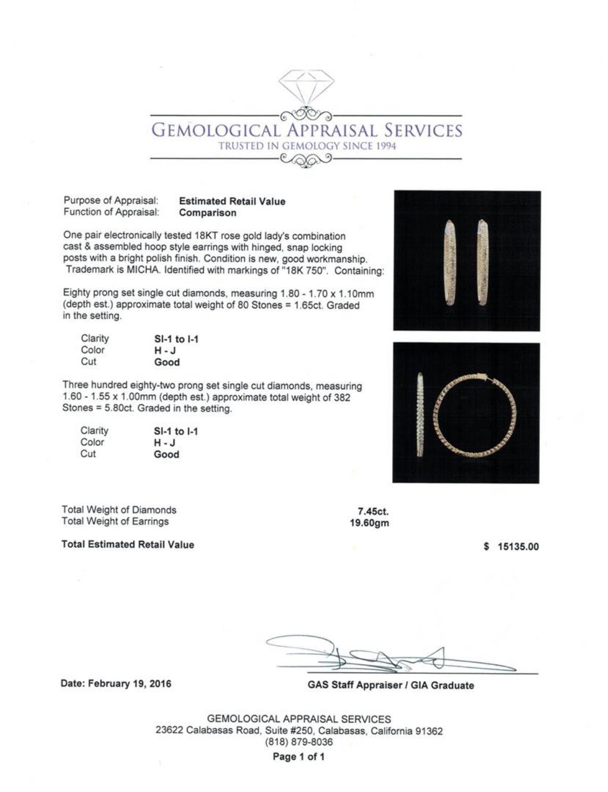 One pair electronically tested 18KT rose gold lady's combination cast & assembled hoop style earrings with hinged, snap locking posts with a bright polish finish. Trademark is MICHA. Identified with markings of "18K 750". Condition is new, good workmanship. Containing: Eighty prong set single cut diamonds, measuring 1.80 - 1.70 x 1.10mm (depth est.) approximate total weight of 80 Stones = 1.65ct. Graded in the setting. Clarity: SI-1 to I-1. Color: H - Good Three Hundred Eighty-Two prong set single cut diamonds, measuring 1.60 - 1.55 x 1.00mm (depth est.) approximate total weight of 382 Stones = 5.80ct. Graded in the setting. Clarity: SI-1 to I-1. Color: H - Good. Total Weight of Diamonds 7.45ct. Total Weight of Earrings 19.60gm. GAS Appraised.